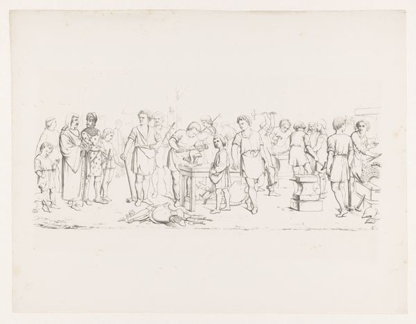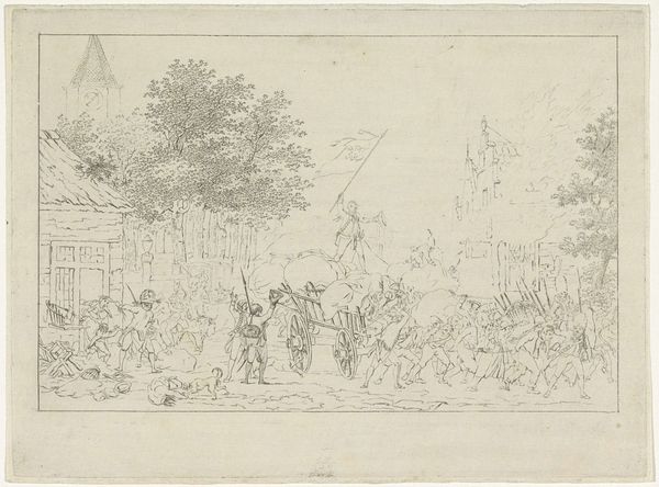 Editor: This is "Village Street with a Quack and Other Figures" by Jan van Goyen, dating from 1631. It's a pencil drawing. I find it really interesting how much detail he packs into such a light sketch. What catches your eye about it? Curator: The distribution of mass and void is of significant interest. Van Goyen masterfully utilizes the blank space of the paper to suggest depth and atmosphere. Observe how the density of the pencil lines increases toward the lower portion of the composition, anchoring the scene. Do you notice how the buildings are barely described? Editor: Yes, it's almost like he's more interested in the figures themselves, the "volume" they create on the page versus the architecture. I wonder why he chose such a fleeting medium like pencil for such a detailed street scene? Curator: Indeed. Pencil, typically regarded as a preparatory medium, takes center stage here. It’s fascinating how Van Goyen leverages the inherent qualities of the material—its capacity for subtle gradations and delicate lines—to construct a seemingly spontaneous, yet meticulously rendered, composition. How does the uniformity of the line weight affect your reading? Editor: It gives it a sense of immediacy, as if capturing a fleeting moment. Maybe he wasn’t aiming for photorealistic accuracy but instead trying to convey the feeling of a bustling marketplace. I suppose the rough quality almost emphasizes the rough-and-tumble world he depicts! Curator: Precisely. Furthermore, the seemingly casual arrangement of figures contributes to a sense of dynamic movement within the picture plane. The eye is drawn in multiple directions, preventing any single focal point from dominating. Editor: I see what you mean. Initially I saw the figure on the elevated platform. But I missed the smaller groupings to the left. I’ll never look at a simple pencil drawing the same way again! Curator: It's the inherent paradox of seeming simplicity versus complex artistry, isn't it? A formal reading truly reveals the artist’s choices in guiding our vision.