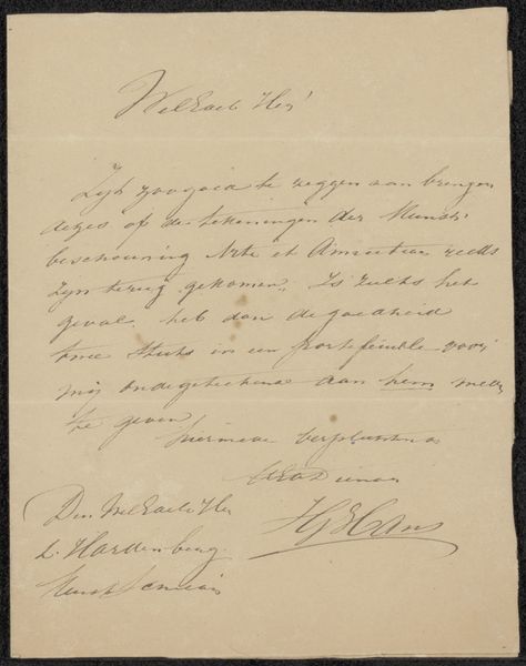 Curator: We’re looking at a fascinating artifact, a letter simply titled “Brief aan Philip Zilcken,” which translates to “Letter to Philip Zilcken.” The artist is none other than Mary Cassatt, and the date is given as between 1854 and 1926, corresponding with Cassatt’s life. The medium here is pen and ink, which provides insight into Cassatt's thoughts at that time. Editor: It's delicate, almost like glimpsing a private thought. The script is graceful but urgent, creating a sense of immediacy. The ink, now faded, speaks to the passage of time and makes me wonder who Philip Zilcken was and the nature of the communication. Curator: That's a good question. Philip Zilcken was a Dutch artist, critic, and writer, so there must be some sort of contact regarding the catalogue of artwork between them. And while Cassatt is best known as a painter and printmaker, she frequently used drawing as part of her artistic process. Correspondence like this shows an entirely different, more intimate dimension to Cassatt, particularly as she engaged with the art world. Editor: Exactly. Think about what this reveals about women artists and how they worked with galleries or how their pieces got exhibited in that period of history! Here we can see her speaking her mind. Even the casual nature of the pen-and-ink suggests a comfortable relationship—an insightful peek behind the curtain of a famous artist at work! It prompts questions about the support structures that facilitated Impressionism as a movement. Curator: Definitely. This unassuming piece becomes an important piece of art historical evidence! These seemingly small artifacts are what can broaden our view of art's role in its original setting. Editor: I think about the power dynamics inherent in these correspondences, the negotiations, the struggles to be seen and understood as a woman artist… Curator: Precisely. Studying objects such as these open possibilities and discussions concerning Cassatt's position, influence and work as an Impressionist. Editor: Looking closer here really helps me feel a stronger bond with an artist and an art movement I have loved all my life.