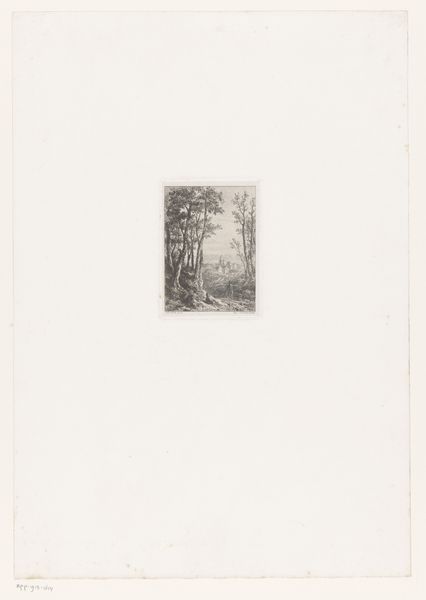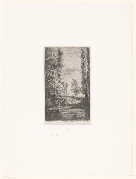 Alfred Elsen made this landscape, Berglandschap met meer en bomen op de voorgrond, using etching, a printmaking technique, sometime between 1865 and 1914. With etching, a metal plate, usually copper, is coated with a waxy, acid-resistant substance called a ground. The artist then scratches an image into this ground, exposing the metal beneath. When the plate is immersed in acid, the exposed lines are eaten away, creating grooves. The deeper the grooves, the more ink they will hold. The plate is then inked, wiped clean, and pressed against a sheet of paper, transferring the image. The resulting print bears the marks of this alchemical process: the crisp, precise lines that capture the trees in the foreground and the distant hills. But it also bears the traces of labor. The artist's hand meticulously scoring the plate, the repetitive act of inking and printing. Etching was part of a broader printmaking culture, which democratized art production. Understanding the labor and process behind this seemingly simple image allows us to appreciate the ingenuity and effort involved, blurring the lines between art and craft.