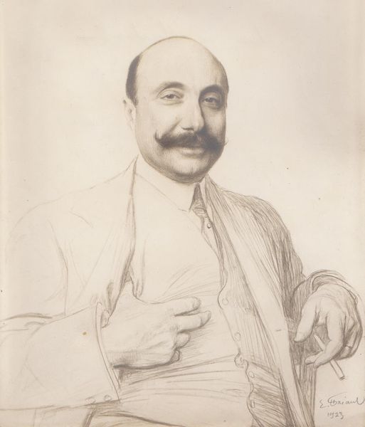 Editor: Here we have Hermann Struck's portrait of Felix Warburg. It's an etching, giving it a delicate, almost fragile quality. What strikes me is Warburg’s gaze – it's intense, yet also seems to hold a hint of vulnerability. What do you see in this piece? Curator: Beyond the surface, I see a visual representation of power and privilege in a society grappling with social change. Struck, a Jewish artist, portrays Warburg, a prominent Jewish financier. How does the act of depicting Warburg, a figure of immense wealth, challenge or reinforce existing power structures within the context of early 20th-century Europe? Editor: That's fascinating! I hadn't considered the artists’ and sitter’s identities as challenging established norms. Curator: Exactly! And let's consider the flower on his lapel—a subtle symbol of wealth and status, but also perhaps, a delicate reminder of the fragility of such positions amidst rising social unrest and antisemitism. The portrait prompts us to consider the complex intersection of identity, wealth, and social responsibility. Editor: I never would have thought to look at it that way. Thank you! Curator: Of course. This close looking makes us think about the role of art in reflecting and challenging society.