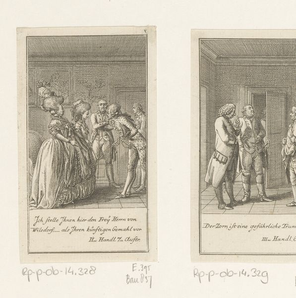 Daniel Nikolaus Chodowiecki created this print, “Huwelijksaanzoek van een landbouwer”, which translates to “A Farmer’s Marriage Proposal,” using etching, a printmaking technique, in the late 18th century. Etching involves coating a metal plate with a waxy, acid-resistant substance called a ground. The artist then scratches an image into the ground, exposing the metal beneath. The plate is then submerged in acid, which bites into the exposed lines, creating grooves. Ink is applied to the plate, filling these grooves, and the surface is wiped clean. Finally, the plate is pressed onto paper, transferring the inked image. The linear quality and fine details of the scene are a direct result of this process. The etched lines have a crispness and precision that are hard to achieve with other methods. Through this repeatable process, Chodowiecki could disseminate his narrative widely. The image's narrative is simple, yet it speaks volumes about labor and class. The act of proposing marriage is set against the backdrop of rural life. This speaks to the social context of the time, reflecting the lives and values of the working class. It reminds us to consider the means of production in which images are created, and the way in which these processes imbue the artwork with cultural significance.