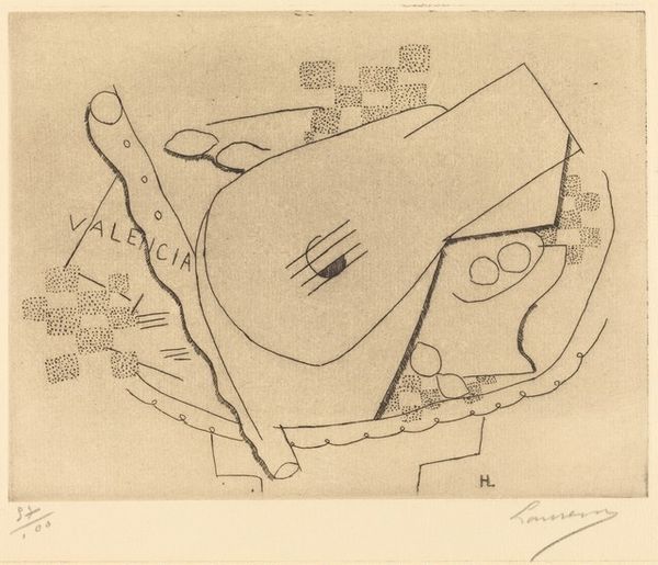Curator: Here we have Marc Chagall’s "House in Peskovatik," created in 1922. It’s an etching and ink drawing printed on paper, a stunning example of his modernist style. Editor: It feels unbalanced, almost dreamlike. The house seems to teeter, defying gravity. The details, though, are sharp and carefully rendered. Curator: Chagall's process often involved a negotiation between memory and material constraint. As a print, consider how the etching lines are physical imprints, both mirroring and distorting the memory of this locale. Think about the zinc or copper plate, its availability during a tumultuous period in the artist's life, influencing scale and mark-making. Editor: And those skewed angles! There's an unsettling feeling evoked by the house's placement. Is that a figure peering out of the window, and another one struggling to keep the building upright? This symbolises instability, doesn't it? Perhaps a reflection of the upheaval of the time, rendered in architectural metaphor? Curator: It’s interesting you point out the seeming struggle to hold the building upright. I believe this can be seen as an observation on labor conditions in the early 20th century, specifically on Jewish populations who often lived in these areas. Editor: I hadn't thought of it that way. I was leaning more toward themes of displacement, maybe a visual echo of cultural memory, clinging to a home that might be lost, or perhaps referencing loss in a much broader and deeper way. Note how the "Tut" inscription is presented alongside figures enclosed in, around, and outside the edifice...almost a performative play on in/out-group relations. Curator: I see what you mean. Yet I would suggest it may also comment on class structures within society. This would imply access to certain means. Etching is, in its way, a means to disseminate this very idea. Editor: Indeed, seeing both elements working together really amplifies its potency. Thank you for providing these important connections, illuminating the historical layers beneath its imagery. Curator: Thank you for shedding light on its symbology and meaning. Both angles really add to understanding the piece, I think.