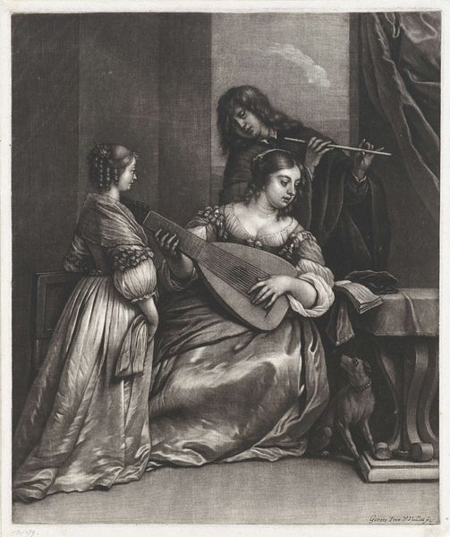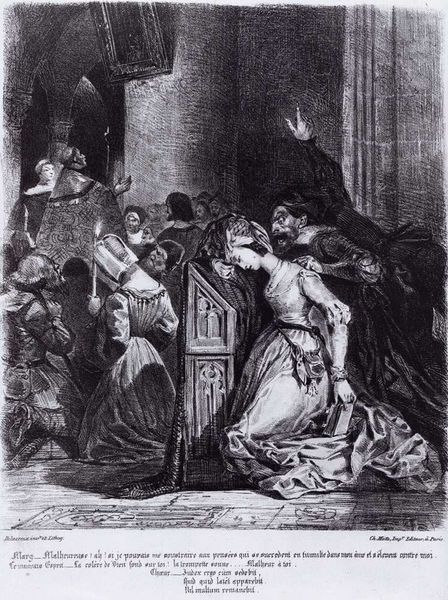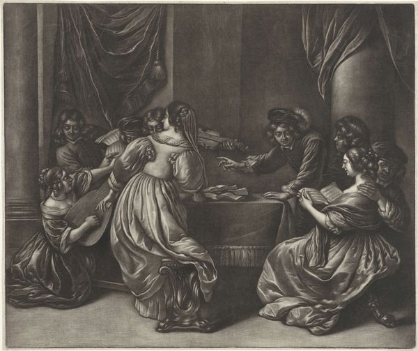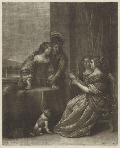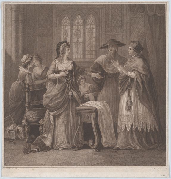 Curator: This is George Clint’s "Falstaff’s Assignation with Mrs Ford," currently residing at the Tate Collections. It captures a scene rife with tension and anticipation. Editor: My first impression is one of unease, a sense of something not quite right. Mrs. Ford seems burdened, not joyous, despite the suggestive title. Curator: The work draws upon Shakespeare's "The Merry Wives of Windsor", a comedy that, within its social context, played with anxieties around class and reputation. Clint’s illustration, in this light, feels almost subversive. Editor: Note the goldfish bowl, a symbol of entrapment and fleeting beauty. The gaze of Mrs Ford seems very much locked to the goldfish within. Curator: Absolutely, and we can also examine the placement of the screen, the concealed Falstaff, the power dynamics at play within the burgeoning middle class, eager to mimic aristocratic pastimes and manners. Editor: It's as if Clint captured a moment where societal expectations and personal desires collide, leaving a residue of discomfort. Curator: Indeed, it prompts consideration of how artistic renderings influence our understanding of literature and social decorum. Editor: A fascinating intersection of text and image, revealing hidden depths in a seemingly lighthearted tale.