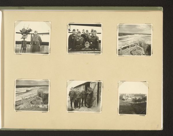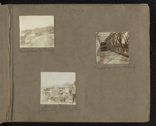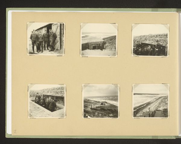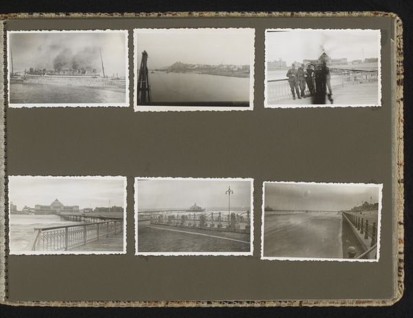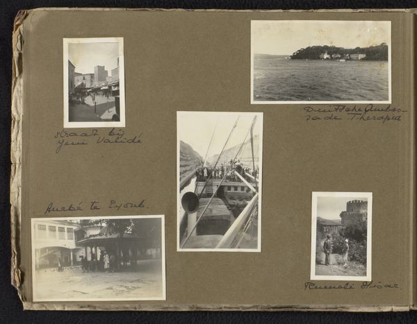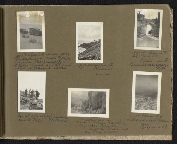 Editor: Here we have "Vijf foto's van een reis naar Griekenland en Turkije" – Five Photos from a Trip to Greece and Turkey, an album print from around 1926-1929 by Carolina Frederika Onnen. It feels very fragmented, almost like snapshots from a travel journal. What structural elements strike you most in this compilation? Curator: The most prominent aspects, structurally speaking, involve the careful arrangement and juxtaposition of diverse viewpoints. The five photographs, each distinct, form a collective visual rhythm. Note how the rigid geometry of architecture and the curvilinear forms of landscapes interplay, generating visual interest. Editor: So it's the composition within the larger composition that stands out? The shapes of each photo versus how they're laid out as a whole? Curator: Precisely. Examine the tonality, how Onnen balances light and shadow. Consider the composition within each photograph too, particularly how they draw the eye and structure depth. For example, look at the mosque photo and how vertical its visual perspective is. Editor: I notice the handwritten captions near each image. Do you think this provides insight into the photographer's intention? Curator: Those inscriptions act as critical paratext. They don't just describe the scenes, they add another layer of information. By guiding our reading of the image, they can tell us not only where it was shot, but provide clues of personal significance from that period. Editor: That’s a helpful way of considering it! I was initially drawn to the album as a simple travelogue, but thinking of it as a complex set of geometric and tonal choices shifts the entire interpretation. Curator: Indeed. It moves from a personal diary into an act of formal composition, allowing the viewer to consider shape, light, inscription and personal narrative at once.