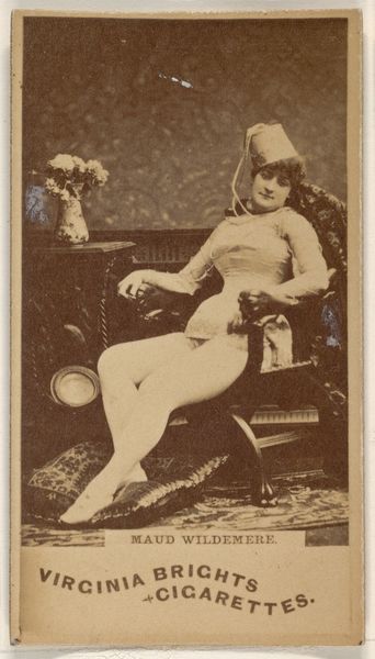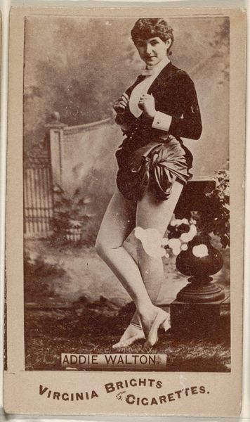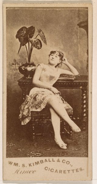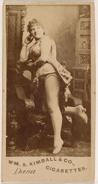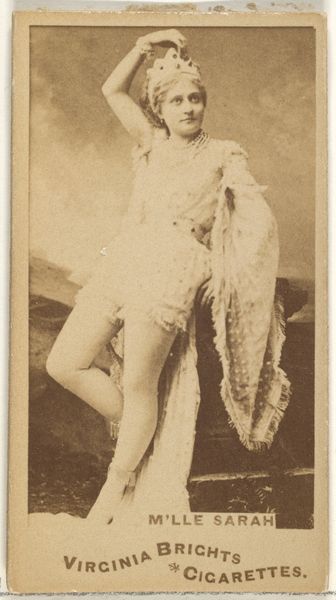 This is a photograph of Frankie Raymond, from the Actors and Actresses series (N45, Type 8) for Virginia Brights Cigarettes, created by Allen & Ginter. The sepia tone imbues the image with a sense of distance. Raymond's pose, perched on what appears to be a decorative plinth, creates a dynamic interplay between form and surface. The composition directs our gaze along the diagonals of her limbs and towards her face. Notice the subtle contrast in texture between the softness of her skin and the rough, ornate carvings of the plinth. This juxtaposition invites us to consider how surfaces interact and contribute to the overall visual experience. The theatrical backdrop adds another layer of artifice, disrupting any sense of naturalism. Raymond's carefully arranged posture and costume challenge conventional ideas about representation, blurring the lines between the authentic and the performed. The photograph is a study in surfaces, representation, and the structural elements that compose our perception.