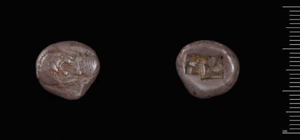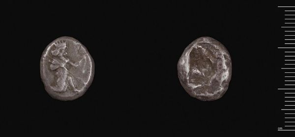 Editor: Here we have the Siglos of Croesus of Lydia from Sardis. It's... well, it's a coin, and it looks quite old, made of a dull silver. What strikes you first about its visual properties? Curator: The most immediate aspect is the planchet's shape itself, deviating from a perfect circle. Its slightly irregular form draws attention to the process of its creation, emphasizing materiality over idealized form. Note the deliberate placement and compression of the lion and bull motifs, how that tension affects the composition. Editor: So, the controlled compression gives it a certain energy? Curator: Precisely. The formal elements are in direct conversation with each other, creating an internal dynamism that transcends its function as mere currency. A fascinating demonstration of form dictating content, wouldn't you agree? Editor: Absolutely. Thanks for pointing out these aspects!