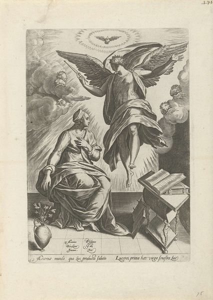 This is an anonymous print depicting the "Vision of the Seven Lampstands." Here, the seven lampstands are potent symbols from the Book of Revelation, each representing one of the seven churches of Asia Minor, radiating divine light and vigilance. Note the figure of Christ, illuminated and central, standing amidst these lampstands. His outstretched hand holding seven stars, further reinforcing the idea of heavenly guidance. Observe the kneeling figure, likely John, overwhelmed by this divine revelation. This awe-struck posture, with hands raised in supplication or shock, echoes gestures found in ancient depictions of epiphany, like those of Emperors in Roman art. The gesture, passed down through time, continues to evoke profound emotional states. The power of this image lies in its ability to tap into our collective memory, evoking the sublime and the fearful, reminding us of the cyclical nature of prophecy and its eternal return.