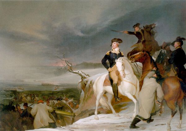 Editor: John Trumbull’s oil on canvas from circa 1797, titled “Lieutenant Thomas Grosvenor and Servant,” feels immediately like a scene plucked from a grand adventure— a slightly chaotic one, judging by the fallen figure at Grosvenor’s feet. What leaps out at you when you look at this work? Curator: Oh, adventure indeed! But, perhaps, a touch more complicated than just derring-do. I'm immediately drawn to the implied relationship, fraught as it might be, between Grosvenor and his…attendant. What is their connection in this tumultuous scenario? The servant almost seems to be both protecting and being protected. I wonder what it tells us, not just about these men, but about the era’s social dynamic. Notice how the servant is positioned slightly behind Grosvenor, armed, but his gaze seems to hold both alertness and a certain apprehension. Does Trumbull want us to see the implied tensions? Editor: That's fascinating; I hadn’t considered the subtleties in their dynamic. I was caught up in the sword and the battlefield. But thinking about it now, it's clear that the relationship goes deeper than mere master and servant. Curator: Absolutely. Think about the societal norms of the time and Trumbull, even if subtly, presents an ambiguous vision. There is, on the one hand, protection from the attendant. Yet Grosvenor clearly benefits and maintains position because of these dynamics. Is it possible that their intertwined fates on this “adventure” transcend those norms? Editor: It makes you consider all the stories layered beneath the surface of what seems, initially, just a historical portrait. I’ll certainly carry a different understanding of this artwork. Curator: Excellent! I think that’s the key; that initial glance can give you narrative, but digging for social tension adds complexity, transforming art from simple imagery to nuanced historical exploration!