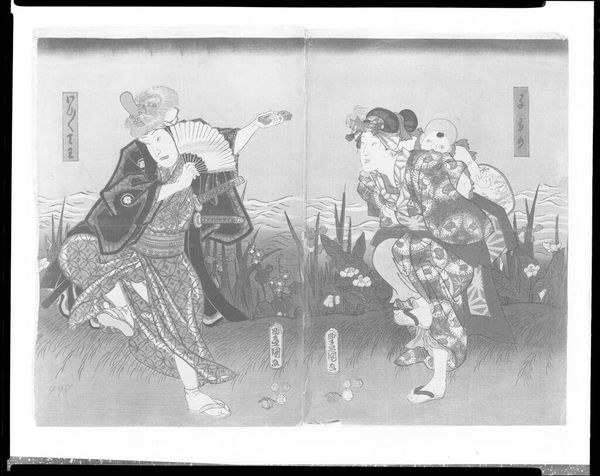 Editor: Here we have Kubo Shunman's "Courtesan and Attendants Beneath Cherry Blossoms," a print on paper. It feels very serene and composed. What stands out to you about this piece? Curator: I'm struck by how Shunman depicts the courtesan and her attendants. Their presentation signifies societal expectations, doesn't it? How might their clothing and stylized movements reflect the limited roles available to women at the time? Editor: I see what you mean. They seem almost frozen in place. What can this tell us about the agency of women in that era? Curator: Exactly. Notice the cherry blossoms. While beautiful, they are fleeting, ephemeral. Could they be a symbol of the transient nature of beauty or even life itself for these women? Food for thought, isn't it? Editor: Absolutely, I never considered the symbolism of the cherry blossoms in relation to the figures. Curator: These images prompt us to examine gender roles, societal expectations, and the ever-present negotiation of power, even within seemingly tranquil scenes.