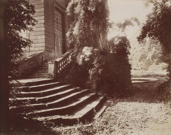 Editor: So, here we have Henry Pauw van Wieldrecht's photograph, "Onderste verdieping en de tuin van het huis Villa Louise in Menton," circa 1886-1896, a print held by the Rijksmuseum. There’s almost a dreamlike quality to the image. What captures your attention in this composition? Curator: The immediate impression is one of balance, despite the asymmetry of the architectural subject. Consider the tonal arrangement. The brightness of the villa's facade is contrasted by the dark mass of the vegetation. Note, too, how the linear structure of the building itself offers a counterpoint to the organic forms spilling over its balconies. Editor: The interplay between light and shadow is interesting. Does that contrast serve a particular purpose here? Curator: Indeed. The chiaroscuro directs the eye, leading us through the image plane. Observe the textured surfaces of the flora juxtaposed against the smooth planes of the villa's architecture. It isn't just a representational technique. This manipulation of light serves to highlight the interplay between the constructed and the natural. What meaning emerges from that juxtaposition? Editor: I see. The sharp, rigid architecture softened by the untamed garden. It makes you consider their relationship rather than seeing them as separate. Curator: Precisely. Note, furthermore, the surface qualities of the print. The photographic process itself—the textures embedded in the emulsion—contributes to the overall aesthetic. Editor: It’s almost as if the artist is reminding us we're looking at a photograph, not reality itself. Thank you. I noticed how the contrast and structural elements added more layers of complexity to what seems like a nice photo. Curator: Precisely. Deconstructing visual components reveals intention and transforms observation into understanding.
