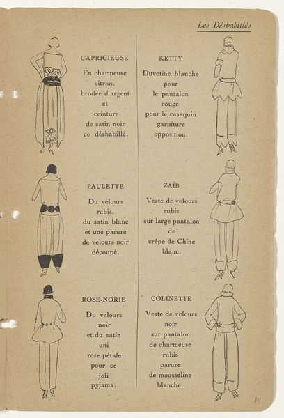 Editor: Here we have "Toujours Chic Hiver 1921-1922: index" by G-P. Joumard, a pen drawing from the Rijksmuseum. It strikes me as a really elegant, almost clinical display of fashion designs, like a blueprint for chic. What's your take? Curator: This fashion index provides insight into the societal forces shaping women's roles post-World War I. We see a departure from overtly decorative styles towards more streamlined silhouettes, reflecting a shift in social expectations and a growing sense of female independence. Joumard's work demonstrates how fashion was not just about clothing but also about articulating new identities. Notice how the descriptions highlight luxury materials, hinting at the exclusive clientele targeted by such designs. Does the somewhat muted presentation influence how you interpret it? Editor: Definitely. The subdued style sort of mutes the luxury, making it feel less frivolous somehow. It’s presented almost as an industrial design document. So, the clothes embody a move toward independence, but the presentation emphasizes industry, commerce and aspiration, all at once. Curator: Precisely. And consider where this would have been displayed – likely within fashion houses or journals catering to a specific socio-economic bracket. The accessibility of this imagery was limited, thereby enhancing the allure and exclusivity of the garments themselves. Does knowing this change how we view these designs now? Editor: It does. Thinking about it existing in a closed environment changes the dynamic. Now it feels less like simple aspiration, and more like carefully constructed desire, which you only get by belonging to an exclusive "in group". It all becomes incredibly intentional, when we consider it that way. Curator: It’s fascinating how understanding the socio-political landscape can reshape our understanding of what might initially appear as mere fashion sketches. Editor: Absolutely. I’m now much more aware of how these designs functioned within a larger, carefully constructed cultural system.