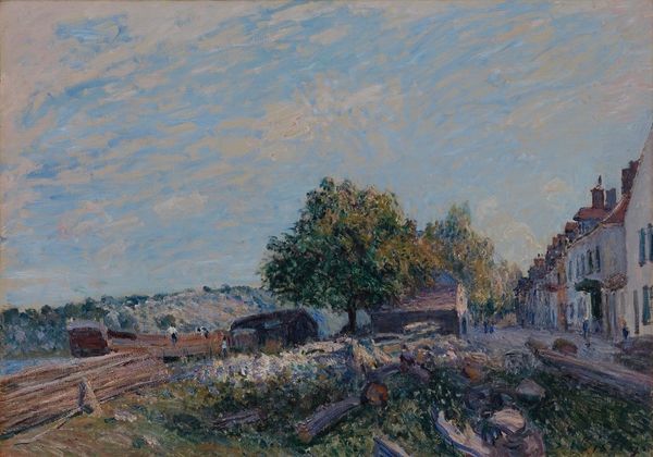 Editor: This is "Maisons Au Pied D’une Falaise," Houses at the Foot of a Cliff, by Edgar Degas, made around 1895 to 1898 using oil paint. It feels very subdued, almost muted. The houses seem nestled into the landscape, but there’s a sense of… oppression, maybe? What do you see in this piece, particularly considering the period it was created in? Curator: It's fascinating you pick up on a sense of oppression. Looking through the lens of historical context, late 19th-century France was a period of intense social and political upheaval. While Impressionism celebrated fleeting moments of beauty, Degas, particularly later in his career, seems to hint at a more complex, and perhaps even critical, view of modern life. Consider the landscape – not an idealized pastoral scene, but a rather claustrophobic view of buildings almost swallowed by the earth. Who might have inhabited those houses, and what were their experiences? Editor: So, you’re suggesting this landscape might be less about nature and more about the people and the power structures that shaped their lives? The way the houses seem almost consumed by the hill really speaks to that now. It feels less idyllic and more like a statement on class or societal pressures. Curator: Exactly. Think about who controlled land, resources, and even artistic representation. Degas was part of a privileged class, yet this painting offers a glimpse into the lives potentially constrained by that very system. Is he offering social commentary or just personal observations? Is he explicitly thinking of power? Maybe it's about the female figures in his dance scenes or bathers, all placed within contexts that both revealed and, arguably, re-inscribed gendered social hierarchies. Can we separate these contexts? Editor: That connection to his other works adds a whole new layer! I initially saw a landscape, but now I'm thinking about the human element and Degas's broader engagement with social issues and representation. It really forces us to ask whose stories are being told and from what perspective. Curator: Precisely. Art isn’t created in a vacuum. By questioning the power dynamics inherent in seemingly simple scenes, we can begin to understand the complex interplay between art, society, and individual experience. I wonder what these cliffs have seen over time. Editor: Definitely something to think about. I'll never look at a "simple landscape" the same way again.