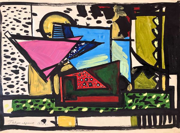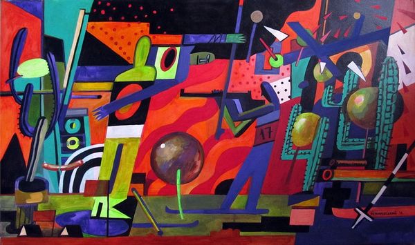Editor: So here we have Bruno Cassinari's "Finestra Verde" from 1977, an acrylic on canvas. The bold color and somewhat haphazard geometric forms create such a unique atmosphere! It almost feels like I'm looking through a fractured kaleidoscope. How do you interpret this work? Curator: Cassinari's work sits intriguingly within the context of post-war Italian art, doesn't it? Looking at this through a historical lens, Expressionism in Italy after the Second World War served a really vital social function. He painted this at a time when geometric abstraction dominated. Do you see how Cassinari both adheres to and departs from geometric visual languages of the era? Editor: Well, yeah. It has geometric components, but the application is very gestural. The "window" doesn't really contain anything recognizable. Is that tied to the post-war context? Curator: Absolutely. Abstraction, like here in Cassinari’s work, moved into a subjective language of interiority. This departure became symbolic of a move away from the formal constraints of earlier abstraction towards something that acknowledged lived human experience, even trauma. You see the violence of brushstroke? This painting becomes a site for Cassinari to negotiate individual and collective trauma. What do you make of that framing now? Editor: That gives me a totally new way to appreciate what he’s doing here. The vibrant colours are maybe not just aesthetically driven. They could be communicating an inner turmoil! Thanks for offering this insight! Curator: Exactly! It encourages a broader conversation about the socio-political function of art after periods of upheaval and re-evaluation, wouldn't you say?
