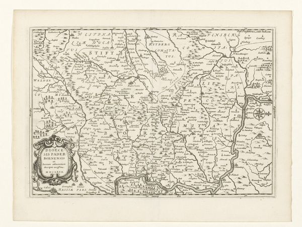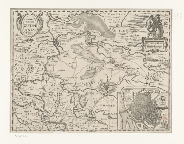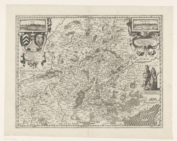 Curator: This print, "Kaart van het hertogdom Limburg met een gezicht op de stad Limburg," produced anonymously between 1617 and 1622, offers a fascinating glimpse into early modern cartography. It's an engraving depicting the Duchy of Limburg. Editor: It strikes me as meticulously crafted, yet also incredibly rigid. The landscapes appear almost like abstract patterns. What story does it tell beyond just geographical representation? Curator: It's about power, certainly. Mapping was a crucial tool for governance and asserting control. This print would have served to visualize the Duke's territory, defining its borders, resources and points of strategic interest in the Diocese of Liege. Editor: You can feel the weight of religious and aristocratic authority through the highly ornate crest on the top left. I am interested in what appears at the bottom right - can you tell me more about it? Curator: This section emphasizes the area's legal structure and identity through prominent Latin nomenclature which aimed to position the Duchy of Limburg on the map of European states. Editor: Absolutely. What really grabs me are the little human figures peppering the landscape, especially along the rivers. Are they idealized portrayals or some vision of societal dynamics? Curator: They reflect a romanticized version of everyday life within the region but their prominence on the map reveals how crucial labour and trade were in making and breaking places. Note too how all human presence seemingly disappears when encountering forested areas; this map thus reveals human action with an element of imposed control onto nature. Editor: A clear indication of societal organization and use of land for the aristocratic eye! Considering that this was during the Baroque period, it must also have offered some measure of local pride for those who identified with this land. Curator: It definitely projects a sense of order and prosperity but let's not forget these images often glossed over complex realities, such as poverty and local resistance, which might challenge established authority. Editor: I suppose looking at it critically allows one to question its intentions in its own time but as much as anything, I really do enjoy discovering old cartographies which give access to past experiences. Curator: Indeed, this anonymous engraving reveals that a lot can be deciphered about cultural pride but as well its underlaying aims by simply looking.