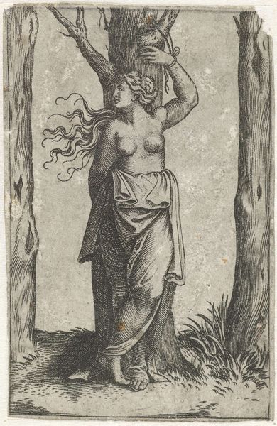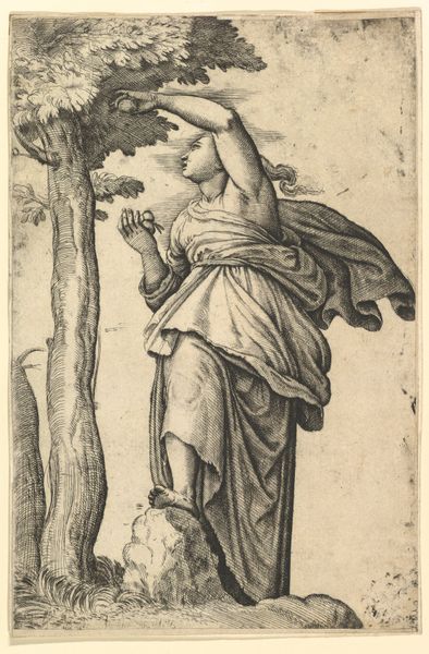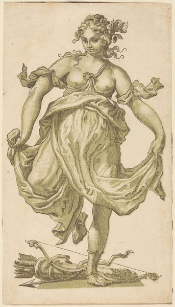 Editor: This is "Flora," a Renaissance print made between 1555 and 1575 by an anonymous artist, using etching as its medium. I'm immediately struck by the detailed line work and the somewhat idealized, yet weighty figure. What do you see in this piece, especially from a material perspective? Curator: I'm drawn to how the artist used the etching process to create this effect. Consider the labour involved in the reproductive process, transforming visual ideas into mass produced material goods, allowing wider access for viewing, owning and copying by artisans and connoisseurs. What socioeconomic factors made prints like these a popular method for spreading images? Editor: That’s fascinating. So, you're saying the *making* of the print is just as important as the image itself? It's about democratizing art, by turning it into a consumer product, and empowering an entire population of artisans. Curator: Exactly! Consider the availability of paper, inks, the very tools needed for etching, as vital considerations and social realities when studying artworks like this one. The quality of these materials also had significant effect on distribution and cost to the consumer. Where do you think the materials came from for creating these works, and who had access to these objects? Editor: Wow, that makes me think differently about this "Flora." I was so focused on her idealized form, but now I see it’s about the larger economic and social machine making her image accessible to the masses, by using readily available paper, affordable inks and skilled but under recognized laborers. Thank you. Curator: Indeed, by interrogating art production, reproduction and circulation as processes, we challenge traditional understandings and class structures inherent in art history. Considering materiality changes how we understand the artistic process, wouldn’t you agree?