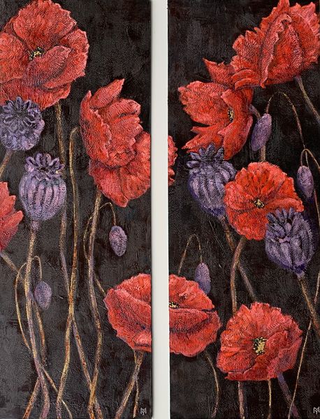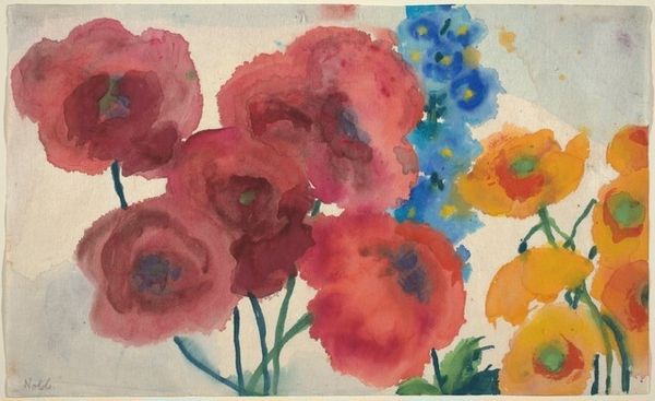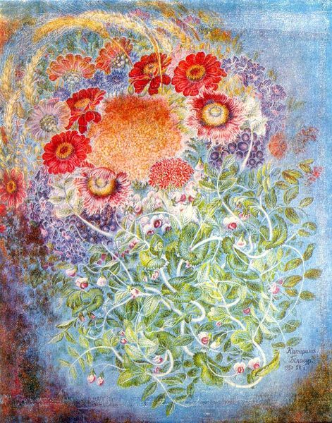 Curator: Here we have Christian Rohlfs’s “Dunkle Cosmeen,” a pastel work from 1935. Editor: My initial reaction is one of disquiet. The colors are so vibrant, almost violently so, yet there’s a somber undertone I can’t quite shake. Curator: Perhaps the dark, almost bruised background is contributing to that unease? Poppies have carried meanings of both sleep and remembrance—often tied to war. Editor: It's interesting that you bring up the materiality: Pastel gives such a tactile quality to the surface. You can almost feel the artist's hand, layering the colors, scratching into the surface. It seems almost urgent, raw. Curator: The composition, too, reinforces that raw emotionality, I think. Notice how the floral arrangement is clustered and crowded; a veritable field pressing forward. There is almost an unsettling feeling about this intensity—and note how this differs from standard depictions of flowers from a bygone era. Editor: Absolutely. Traditional still life is often about portraying control – dominance over nature, you could argue. Rohlfs’ choice of pastel – usually thought of as "delicate" - flies in the face of such assumptions and seems rebellious here. He turns it into something quite muscular and almost violent. Curator: I completely agree. Rohlfs’s engagement with Expressionism suggests an intentional rejection of tradition. Through intense color and energetic mark-making, there's almost a frantic tone here. The symbolic meanings that attach to a red flower are manifold—life, death, blood, and so much in-between. These "dark cosmos" become not a celebration of nature, but perhaps a darker rumination upon it. Editor: Looking again at the medium of pastel – such humble stuff – it is intriguing that Rohlfs elevated the mundane, taking it from being considered mere draftsmanship to something capable of powerful expression. Curator: Indeed. Thinking about it, these visual signifiers work so effectively. We see how the artwork, at once disturbing and beguiling, represents Rohlfs' own grappling with nature and form. Editor: And from a simple piece of chalk and paper, we've uncovered so much more depth than a fleeting impression of pleasant poppies!
