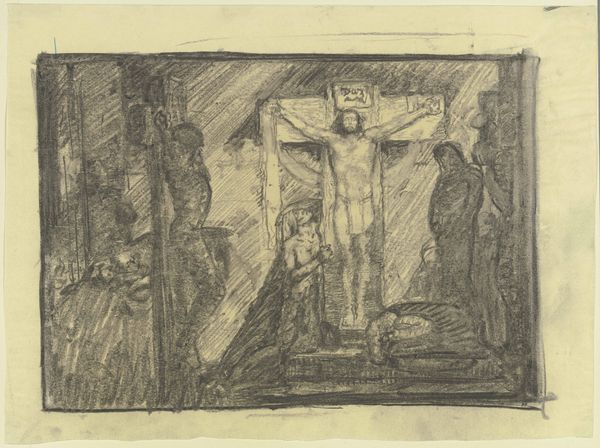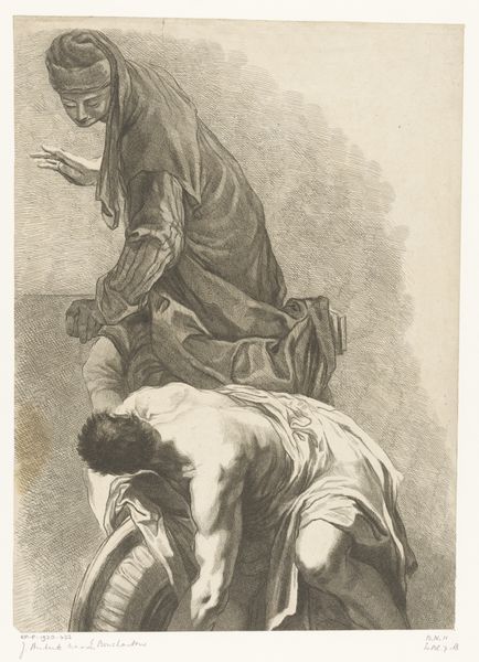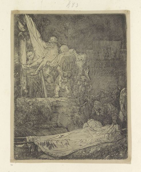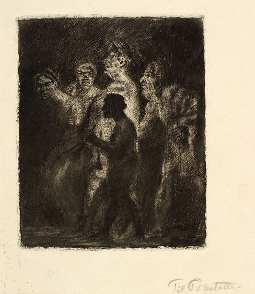 Curator: Welcome. Here we have "Diablerie", an etching and intaglio print by François-Nicolas Chifflart, created sometime between 1845 and 1901. It's currently housed here at the Metropolitan Museum of Art. Editor: Whew. It’s…intense. A very dark piece; shadowy figures all crammed together, almost suffocating. You immediately sense the tension—I’m getting major gothic vibes here. Curator: Indeed. Observe how Chifflart employs a high degree of contrast to delineate form. Note especially the figure at the lower register and his robe contrasted by a hovering demonic form with little regard to anatomical correctness in its features, further emphasized with densely cross-hatched background adding to a sense of anxiety. Editor: He almost looks pinned. The lower figure has this expression… resigned. While above and around him… all those twisted faces. Are they mocking or menacing him? And what about the bare, upright figure behind him? He looms like… like the embodiment of guilt itself! Or judgment maybe. Curator: Quite right! Consider too how Chifflart distributes value within the tonal range. See how areas in shade have dense intricate marks but those features illuminated possess smoother gradations emphasizing emotional impact within representational parameters specific towards intaglio production techniques common among artists working around narrative-driven artworks rooted by principles developed during Romanticism. Editor: I can feel myself getting sucked in! He’s not looking at me. Maybe he wants me—us—to fill in what happens next. It almost has a cinematic quality. Very foreboding. Almost claustrophobic in its staging of what could be understood either literally—perhaps a tribunal setting place or one where the setting stands-in something more figuratively profound as it speaks concerning man struggling facing condemnation. Curator: A compelling interpretation that aptly touches at multiple relevant registers when seeking deeper meanings through examination utilizing stylistic traits prominent regarding visual story through nuanced technical choices. This demonstrates why many academics find Chifflart particularly interesting as an exemplar bridging late Romantic sensibilities navigating darker human conditions explored employing classic graphic modalities which speak broadly beyond immediate temporal restraints. Editor: It gives me chills—good chills, I might add—in realizing artworks similar this could touch upon questions about existential truths regarding power or consequences throughout societies despite vast differences ranging throughout various histories existing globally. Perhaps such connections serve toward greater individual or unified introspective contemplation for humanity's potential overall pathing together moving ever-forwards amidst persistent dilemmas. Curator: Yes. The technical capabilities coupled with artistic sentiment converge, producing a piece remarkably insightful regarding artistic development from older lineages into increasingly more nuanced conversations applicable far beyond Chifflart's original time and concerns surrounding etching mediums.
