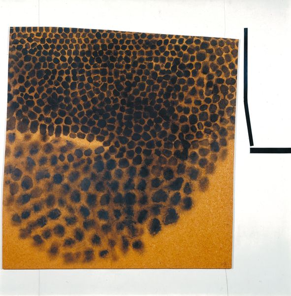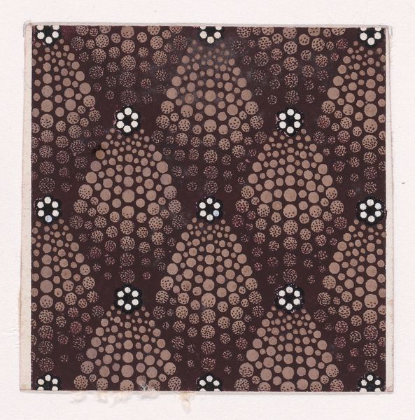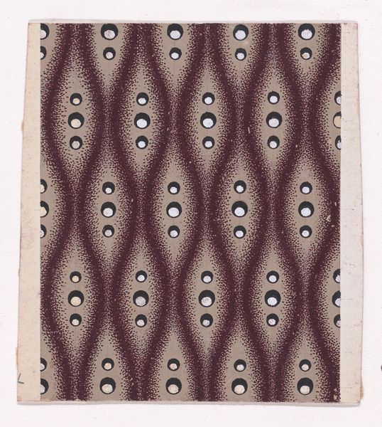 This textile design, of unknown origin, presents a visually intriguing pattern on a small sheet. It features densely packed circles of two different sizes and tones, overlaid with vertical rows of shuttle-shaped motifs. The circles create a textured field, an almost tactile surface that contrasts with the smooth, elongated forms. The arrangement of the circles and shuttle motifs suggests an attempt to structure chaos, where the slight undulation of the vertical stripes introduces movement across the surface. This interplay between order and disarray is crucial. Are we seeing a proto-modernist exploration of form? The piece challenges our perception of texture and pattern as merely decorative. Instead, these elements function as signs within a visual system, prompting us to question traditional notions of representation. Consider how the design destabilizes our expectations by blurring figure-ground relationships, inviting ongoing interpretation and reflection.