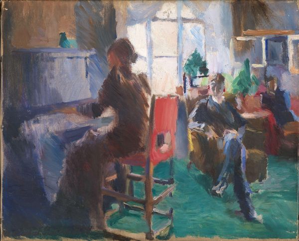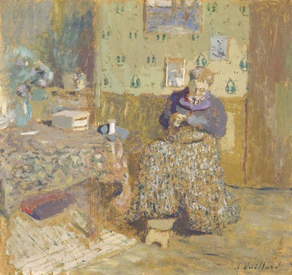 Édouard Vuillard created this oil painting, titled "Marcelle Aron Dans La Salle À Manger Au Château-Rouge," sometime during his career. Vuillard, a French artist, offers us a peek into a domestic interior, likely a well-to-do Parisian home. The painting’s meaning emerges from the cultural context of the French bourgeoisie during the late 19th and early 20th centuries. Vuillard belonged to a group called the Nabis, who blurred the lines between art and everyday life. Their work often depicted intimate, domestic scenes, reflecting the values and interests of their patrons. The seemingly informal scene is quite deliberate. Vuillard’s loose brushwork and muted colors create a sense of intimacy. The composition, with its emphasis on the decorative elements, speaks to the importance of interior design and domesticity in bourgeois culture. It's a glimpse into a private world, subtly commenting on the social structures of its time. To understand Vuillard's art more fully, we can consult period magazines and books about interior design, exhibition reviews and also biographical information about the artist and his social circle. Through this kind of historical research, art becomes a window into a particular moment in time, reflecting the values and aspirations of a society.