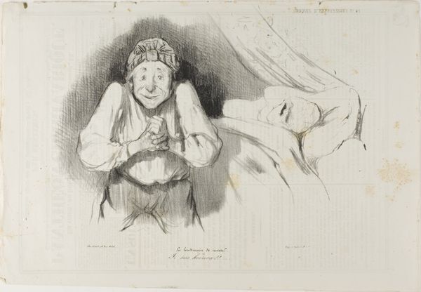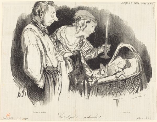 Curator: Here we have Honoré Daumier's "He's really been a little devil . . .". Editor: The title feels laced with irony; I see weariness etched on the parents' faces, a very different story than the playful title suggests. Curator: Daumier was a master of social commentary through lithography. Consider the historical context; this likely reflects the realities of child-rearing in 19th-century France, far removed from idealized portrayals. Editor: Absolutely, and look at the baby's exaggerated features. It's a caricature, almost monstrous. What does that say about societal anxieties around new parenthood and the disruption of domestic life? Curator: I think it speaks to universal experiences – the sleepless nights, the frustrations, but also a certain dark humor. Editor: Perhaps. But the stark contrast between the exhausted parents and the almost demon-like child also hints at broader themes of class and social expectations. Curator: A valid point. It's a complex image, open to multiple interpretations, that's what makes it so compelling. Editor: It certainly offers a sobering, yet darkly comic, glimpse into a very specific historical moment.