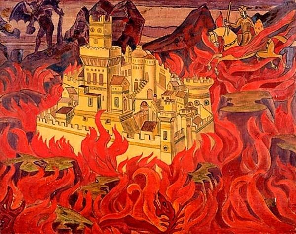 Nicholas Roerich made this painting called 'Book of Doves' with oil on canvas and, boy, does it sing! The colours are muted, like looking through a dusty window, but there’s a real vibrancy in how they’re laid down. You can almost feel Roerich working and reworking the surface, trying to get it just right. Look at the way the paint is layered in the sky and buildings, it's like he’s building up this whole world, piece by piece. I love how the creamy, pale book dominates the foreground, and it makes me wonder what stories it holds. Is it a history book, a fairytale, or maybe a philosophical text? The figures look so small next to it, yet their presence is critical, like they're part of a play being staged right here. Roerich’s work always reminds me of someone like Marsden Hartley, an earlier artist who explored similar themes of spirituality and the sublime. And that reminds us that art is an ongoing conversation, where artists respond to, and reinterpret each other's ideas, making it always new.