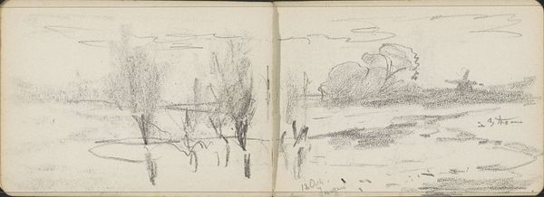 This is a pencil sketch of two figures by a bridge over a river, made by Willem Cornelis Rip. The artist's choice of pencil, a humble material readily available due to industrial production, speaks volumes. Unlike the laborious process of grinding pigments and mixing paints, a pencil allows for quick, immediate expression, capturing fleeting moments with ease. Notice the delicate gradations of tone, achieved through subtle variations in pressure. This immediate style emphasizes the direct connection between the artist's hand and the paper, revealing the artist’s thinking as he composes the landscape. The swift lines and tonal variations create an image that appears almost like a memory fading in and out. This work exemplifies the democratization of art materials, challenging the traditional hierarchy between high art and everyday practices. It reminds us that artistic expression isn't confined to precious materials, but can emerge from the simplest of means.