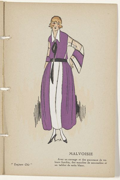 Curator: Here we have “Toujours Chic Les Tailleurs et Les Manteaux, Hiver 1921-1922: Zinnia,” a watercolor fashion illustration by G-P. Joumard, dating from the early 1920s. It’s currently held in the Rijksmuseum's collection. Editor: My immediate response is that she exudes this quiet defiance despite the very prescribed femininity in the clothes, like she's pushing against something. Curator: Definitely! The harlequin pattern of her dress disrupts any conventional expectation of fashionable refinement. Note also the Zinnia title. In the Victorian language of flowers, a zinnia often symbolized thoughts of an absent friend, but could also mean lasting affection and remembrance. Considering that, do you feel this symbolism ties in with her subtle act of defiance you've noted? Editor: I hadn’t considered the floral symbolism! With that in mind, the illustration becomes really compelling as a post-war statement, as if it is encapsulating a time of deep grief and reconstruction. Perhaps Joumard wanted to highlight women finding new and slightly subversive ways to carry themselves after a period of mourning. Curator: That is such an interesting idea about its resonance with the post-war experience and the evolving social codes around that period. I'm fascinated by how her almost severe gaze contrasts with the soft rendering of the fur and the slight iridescence of the watercolor. It has an undeniably magnetic pull to it, despite its relative simplicity. Editor: Absolutely, it’s that contradiction between the softness and severity which gives it such emotional heft! It makes me consider what the illustration aimed to embody about this historical moment and about female identity. It presents a very modern, yet vulnerable, figure to consider. Curator: It’s a valuable example of the interplay between societal expression and individual representation within this moment. Thank you for lending me your ideas. Editor: Thank you, this artwork is compelling for uncovering historical and political complexities while prompting new reflection and insights.