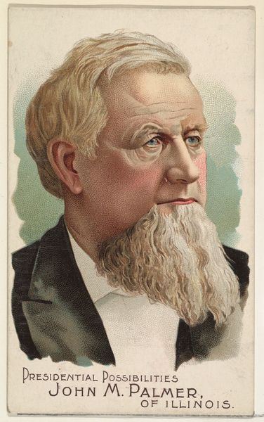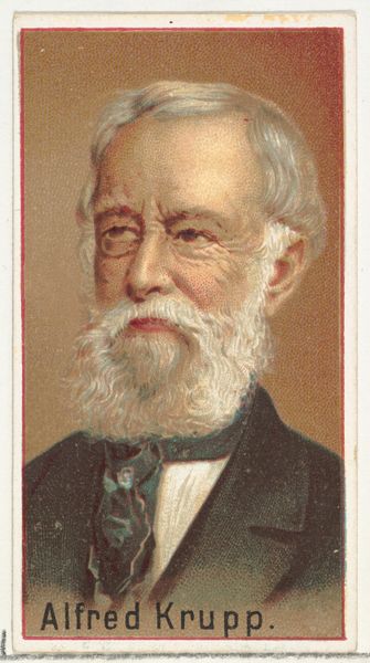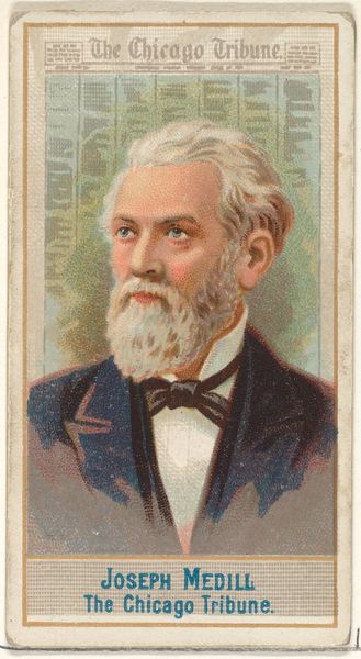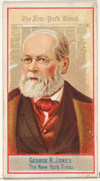 Editor: Here we have a print from 1887, “Charles A. Dana, The New York Sun” as it is named, made as part of the American Editors series by Allen & Ginter Cigarettes. It's a fascinating caricature. I am curious: What do you see in this piece? Curator: The portrait presents a compelling study in contrasts. The textures alone demand attention, don't you agree? The softness of the beard against the crisp lines of the newspaper backdrop. It exemplifies a late, arguably flamboyant take on formal portraiture. Editor: That's a great point! I hadn't considered the textures so closely. Can you explain more about how that ties in to the visual? Curator: Notice how the color palette, although subdued, employs sharp juxtaposition? Dana’s ruddy complexion jumps out against the newspaper's off-white. Note also the scale; presented within this intimate space, it draws attention to line, color and material – what we call its very being, its intrinsic worth as an object. The print embodies not mere likeness, but pure artistic essence. Editor: So you’re less concerned with Dana himself, and more interested in how the picture is structured. Interesting. Thank you for expanding my perspective. Curator: Indeed. Understanding its formal qualities allows for deeper comprehension of visual language and art’s ability to distill concepts, a principle foundational in critical theory. It is through form we access meaning. Editor: Fascinating, a different approach. It makes you look at art, or anything, from a completely structural level, rather than the subject of it all.