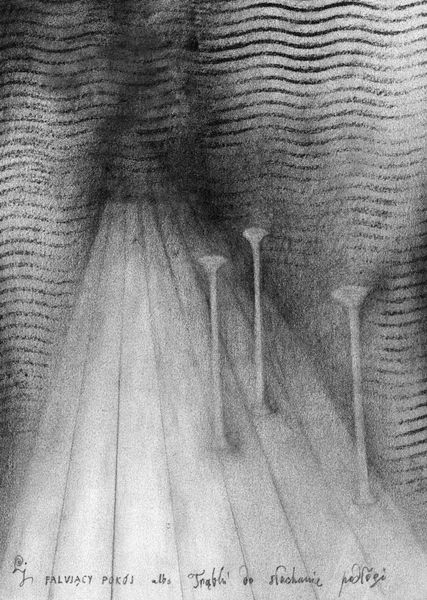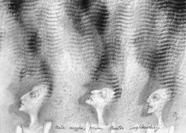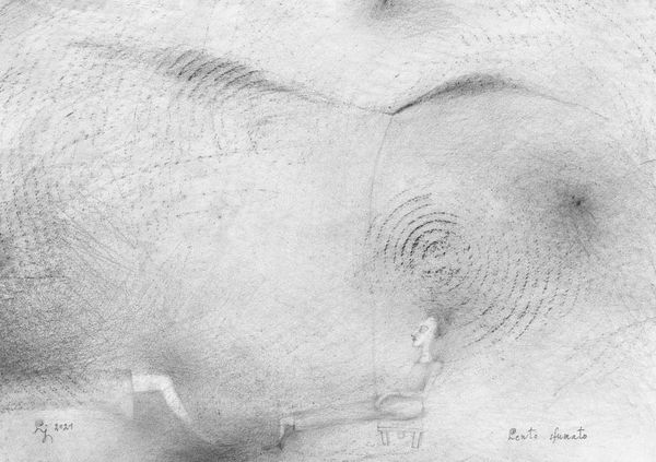 Curator: Lech Jankowski’s "Untitled," created in 2019, invites us to contemplate its subtle power. It’s a graphite, pencil, and ink drawing. What strikes you first about it? Editor: Immediately, I’m drawn to the repetitive use of those fish-like forms. They seem almost industrially produced, each nearly identical, which contrasts strangely with the handmade feel of the medium itself. Curator: Precisely. The artist uses the inherent qualities of graphite, pencil, and ink to challenge the mechanization and commodification of art and experience. The sea, or body of water below, takes the form of repeated, undulating lines. Notice that while each fish seems identical, there are unique flaws when you carefully consider the process. What narrative are these beings participating in? Editor: I read their uniformity as a kind of critique – are we to understand these fish as existing within a supply chain? Are these fish "prepped" and hanging, perhaps on their way to market? It begs a deeper exploration of labor and production in contemporary society. How the materials were used to generate this particular texture is part of the image’s power, speaking to consumption, or potential consumption. Curator: Absolutely, viewing this image in its sociopolitical context, Jankowski explores themes of loss, survival, and resilience, using an artistic language that questions accepted notions of being and otherness. Those almost fossilized forms have a spectral and ghostly presence. Their gaze implicates the viewer. This isn't just about production. It reflects anxieties around global changes. Editor: And, yet, for something tackling such hefty themes, there is a disarming simplicity to the tools used: pencil, graphite, ink. It is the layering, the manual labor inherent in creating each mark that amplifies the meaning. Curator: Indeed. Jankowski's choice to work with traditional mediums establishes a direct relationship to labor and hand production while investigating critical philosophical issues, highlighting a profound artistic sensitivity and the transformative capacity inherent in those mediums. Editor: So, it all comes back to the making. By examining the making and material processes, we unlock deeper layers of commentary embedded in this seemingly simple composition. Curator: Precisely. I'm now pondering the nature of our reflection, looking back at the reflection below, as we depart.