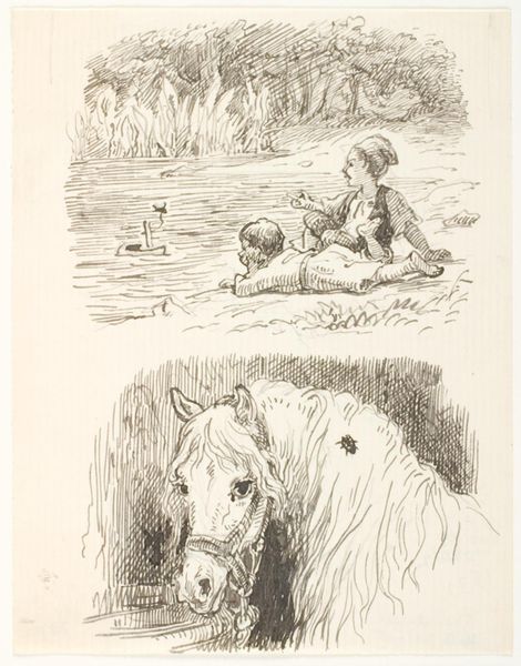 Editor: This is a drawing called "Sketches of a Horse and a Nobleman," its exact date and artist are unknown, and it’s made with ink and pencil on paper. What strikes me is the juxtaposition of these very detailed figures with more gestural, almost chaotic, elements. What do you see in this piece? Curator: The arrangement itself is quite telling. The upper register, dominated by the horse, employs soft, continuous lines, imbuing the animal with a certain elegance. Note how the artist captures the muscular tension through subtle gradations of shading. Now, consider the lower register: the nobleman's portrait is framed within a similarly dark ground as the horse, creating balance. Editor: Yes, I see the tonal balance between the upper and lower images. Curator: Precisely. And have you observed how the textures differ? The horse boasts a polished sheen while the nobleman’s armor shows defined, almost harsh details. The textural contrast gives each subject distinct character, differentiating rank or status. Do you notice how the orientation shifts focus between nature and human? Editor: I didn't quite consider how the artist deliberately varied the mark-making to differentiate these elements. Curator: The formal contrasts invite speculation. The loose grouping of undefined marks on the lower left and the delicate calligraphic marks adjacent to the noble are integral to the artwork's expression, complicating it even further. They’re intentionally ambivalent. They could evoke organic or perhaps even violent associations. What have you gained from this focused approach? Editor: Considering the interplay between the depicted figures and how their visual rendering contributes meaning has offered me new insight into this piece. Curator: Indeed. By understanding formal relationships, we enhance our capacity to extract multifaceted meanings from a composition.
