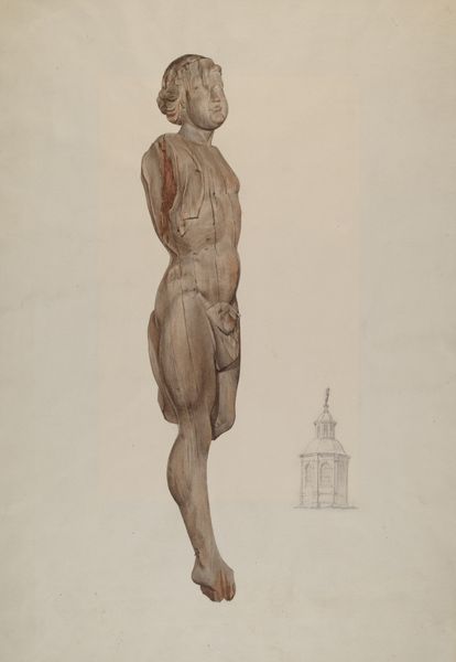 Curator: This is a work entitled "Wooden Doll - Sadie Berman," created around 1942 using graphite, watercolor, and charcoal. What's your first take? Editor: There’s something very austere about this. The color palette is subdued, almost as if bleached. It evokes a kind of solemn stillness, don’t you think? Curator: Definitely. And that starkness invites a deeper consideration of childhood during wartime. Dolls often represent innocence, but the era undoubtedly colored such symbols with anxieties and scarcity. It speaks to a world shaped by the global conflict, right? Editor: Exactly! You see how meticulously the artist captured the joints of the doll? It makes me think of the physical making and its context— perhaps reflecting the shortages of the time in limited materials available. Even the way it's presented; there is something exposed and vulnerable in its artificial nature. Curator: That vulnerability speaks to broader themes of identity and representation, especially in light of Berman’s experiences, whatever those may have been. I find it so thought-provoking because it prompts conversations about gendered expectations and how representation influences self-perception. Editor: Absolutely, there's that link between materials, labor, and consumption—a dialogue between high art and everyday existence. I wonder about the doll maker’s craft and skill, how it connects to broader modes of artistic and artisan production of that period. Curator: It also pushes us to reflect on what it meant to create—to maintain a sense of normalcy perhaps. Editor: Agreed. By examining art from a materialist viewpoint, it can reveal a world of processes related to the history and the circumstances of the item’s origin, right? Curator: It surely can, and understanding “Sadie Berman” necessitates addressing questions related to representation, agency, and the social construction of identity. Thanks for this stimulating chat. Editor: My pleasure. Looking at art this way can be so insightful, really opening up perspectives on art creation.