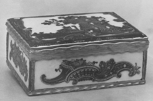 Curator: This exquisitely ornamented object, held here at the Met, is a ceramic snuffbox created sometime between 1730 and 1765. What strikes you most immediately about it? Editor: Its intimate scale is arresting, coupled with the intensely personal nature of what it contained: ground tobacco. It whispers of hidden rituals and individual indulgences, hinting at a bygone era of powdered wigs and courtly life. Curator: Indeed. Considering its period, the snuffbox serves as a potent marker of social identity. Tobacco use was intertwined with colonialism, class, and even gender. Access to finely ground tobacco and equally fine containers like this one declared privilege. The elaborate scenes on the lid likely served as conversation starters, narrating power as much as delight. Editor: Absolutely, there are visual cues aplenty. The lid seems to depict figures engaged in leisurely activities against a palatial backdrop, evoking ideals of pastoral tranquility and aristocratic leisure. Also, the cherubic face nestled amidst the floral carvings lends a whimsical yet reverential air to the object. In psychological terms, one might consider it as an appeal to innocence or purity associated with holding it, in sharp contrast with the user's intentions and substance use! Curator: Your observation speaks directly to the symbolic potency of these objects. The rococo style, with its characteristic embrace of asymmetry and playfulness, can be viewed through a Foucauldian lens—a space of social practice and controlled liberty. While ornate decoration allowed for expression, social protocols for usage—and for *owning* such pieces—would police behaviours of the individual within that specific time period. Editor: True. And I notice too, beyond social constructs, an aesthetic kinship. It feels as though the artist had infused it with a quiet sort of spirit...it speaks to me. The motifs carry emotional echoes through centuries; luxury has rarely felt as bittersweet as it does now. Curator: Perhaps that sense of transience contributes to its continued resonance today. These objects allow us a tangible encounter with an often obscured or prettified historical reality. Editor: Yes, thank you; I think, today, its gentle yet pervasive mood invites contemplation, prompting us to confront complexities and class while appreciating artistry.