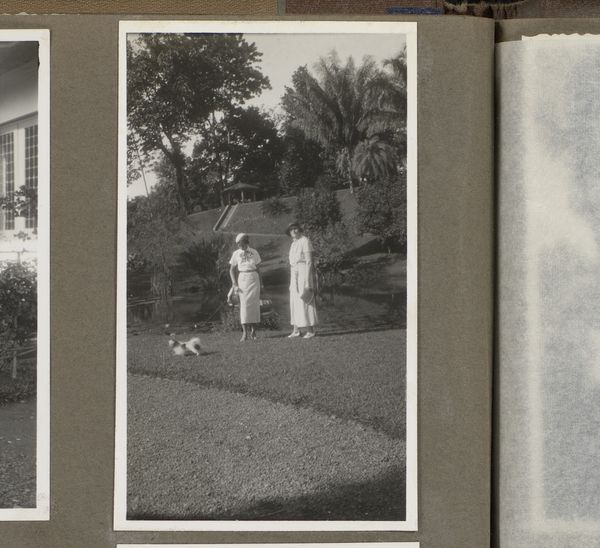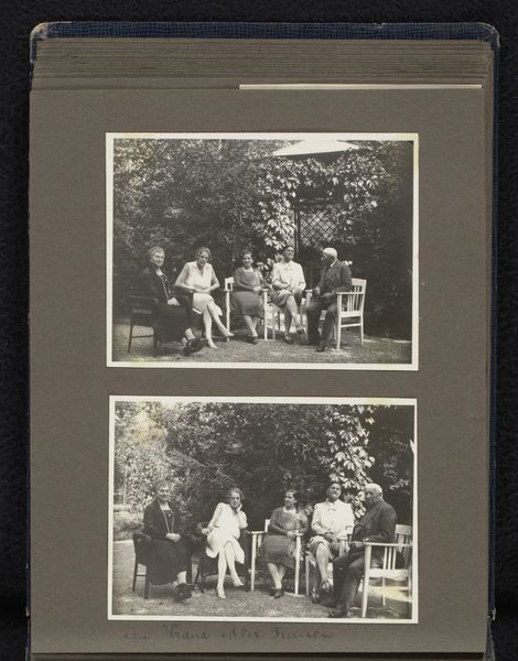 Curator: Here we have an intriguing page from a photograph album. The prints are gelatin-silver, dating roughly between 1920 and 1930, depicting a family in outdoor settings. It's catalogued as "Vier foto's van ouders en twee kinderen, op een tuinbank en in het bos," which translates to "Four photos of parents and two children, on a garden bench and in the forest." Editor: The overall visual impression is of a bygone era, a kind of solemn tenderness. The stark black and white, and the almost faded quality of the images evoke a powerful sense of memory and perhaps the fragility of time. Curator: I find it interesting to consider these photographs not just as family portraits, but as commodities. Each image involved the labour of the photographer, the processing of materials, and the economic means to participate in this form of leisure and self-representation. The clothing worn by the subjects would also suggest social status. Editor: From a formal perspective, the composition across the four photographs provides balance; two showing families in posed settings and two in more natural outdoor settings. I also notice how the light renders soft gradations of tone, emphasizing textures of clothing and foliage, leading your eye to certain figures. The high contrast reinforces emotional solemnity. Curator: Exactly. The choice of background, a controlled garden versus a 'wild' forest, speaks to the era's shifting relationship between domestic life and nature. Also, the uniformity of the prints suggests mass production techniques in photography becoming more widely available. What stories could these images tell about societal attitudes toward childhood? Editor: We can see how each photo has been carefully chosen and cropped; you might say it functions almost as a semiotic code. Note how these placement choices within this familial archive structure an emotional narrative. Curator: I concur. Considering these images, particularly in their material form as part of a photographic album, gives insight into the social function of art production. Editor: Yes. The formalism present highlights both intention and underlying structure which in turn enables further insights into a visual language of family and setting. Curator: Viewing these photos opens a discussion about materiality and production and evokes nostalgia for the past. Editor: Quite so; the inherent beauty here can make viewers consider those things, also providing insight into photographic style, especially composition.