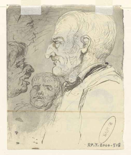 Curator: This is "Drie koppen," or "Three Heads," a drawing in ink by Johannes Tavenraat, dating from about 1840 to 1880, held here at the Rijksmuseum. What are your first thoughts? Editor: They seem burdened, certainly… particularly the face centered at the bottom. There’s a weariness etched into the lines. Curator: Well, notice the quick, almost frantic, linework. You can almost feel Tavenraat experimenting. The support is paper, of course, likely a common, readily available type, hinting at the drawing’s role maybe as preparatory, a moment of sketching before a larger project? Editor: Perhaps, but these faces… they seem to carry a specific weight. That top hat, for instance. In one reading, it might denote aspiration and upward mobility, but there’s also something slightly…off about it, perhaps hinting at a satire of social climbing. Curator: You're focusing on the attire and implied narrative. But consider how the ink bleeds slightly into the paper. What type of ink was he using? What were the environmental conditions of his studio when he worked on this? I bet the consistency of the ink played a role in the rapid, sketch-like quality. Editor: True, the sketch-like quality could certainly stem from the ink, the technology for distribution… However, if we look at the positioning of the faces, there seems to be an internal conversation or conflict visualized here, a symbol perhaps for different states of mind. Curator: That’s an interesting angle, given the era. Though, I'm also thinking of the economics of artmaking at the time and how Tavenraat might have used readily available, cheaper paper precisely for studies like this. Material scarcity drives artistic innovation! Editor: Indeed, but artistic innovation also arises from delving into the human psyche and, as I read it, this piece conveys a somber atmosphere, as though it reveals some unspoken element about humanity. It is so fascinating how he makes the mood so powerfully tangible in a simple, linear, study. Curator: Perhaps the bleak mood is also reflective of the economic conditions from which he drew the support. It does look as though there is slight damage to the support itself... These figures certainly spark multiple ideas! Editor: Definitely. Art draws its meanings both from within and without. A fascinating convergence to ponder!