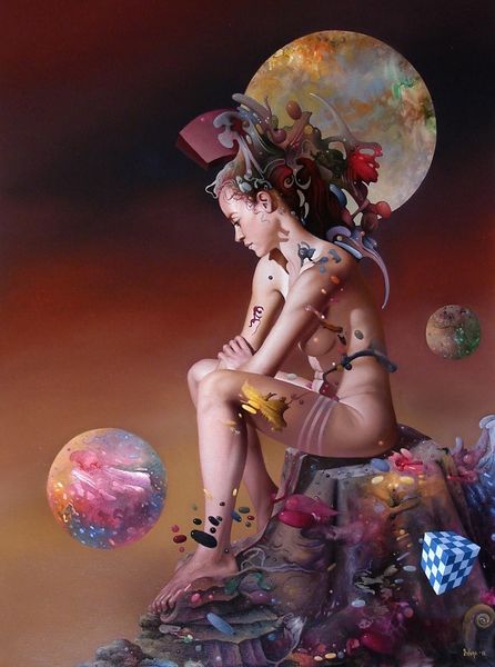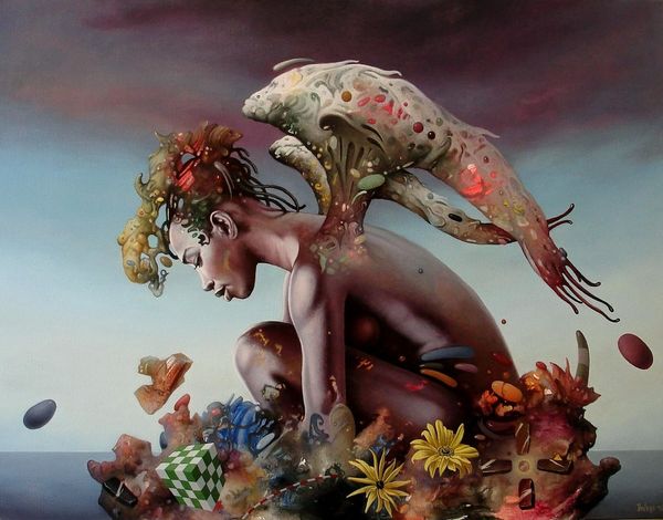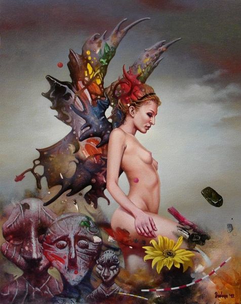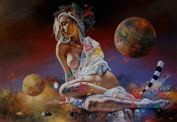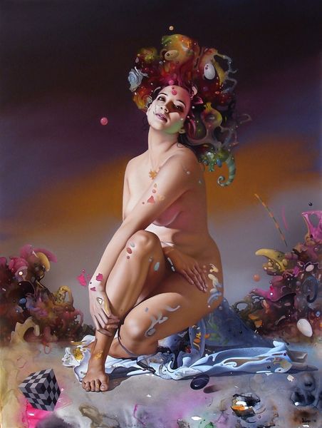 Curator: Here we have "Poverenje," a 2018 acrylic on canvas painting by Dragan Ilić Di Vogo. What’s your initial read on this one? Editor: There's a strange dreaminess here, almost unsettling. The reclining nude feels quite traditional in pose, but the composition… the strange floating elements...it gives an oneiric effect. Curator: Absolutely. The formal elements really work to destabilize our reading of the figure. Note how the flesh tones are rendered with a soft, almost airbrushed quality, while the surreal, almost geological formations around her are treated with far more impasto and textural contrast. The whole structure exists on some form of artificial stage. Editor: Visually, there's a fascinating clash of symbols. The figure, of course, immediately recalls classical Venus figures, representations of love and beauty, however idealized. But it’s offset by floating forms such as the white dove—long a symbol of purity, truth and fidelity—orbiting a distorted, dying planet. The geometric shapes remind one of Cubist fragmentation and the uncertainty of the modern era. Curator: I agree. The painting offers a compelling visual and semiotic play. Let us also observe that, these elements add a layer of complexity to our interpretation of the artist's work, further accentuated through surrealism elements which are visible. Editor: It's interesting how the painting's title translates to "Trust". When considering the strange floating items which defy gravity and space, one has to wonder to what this trust is dedicated: is it toward someone else, or yourself? Is that trust, similarly, stable... or as precarious as these floating rocks? Curator: An incisive question that encapsulates the central tension within this piece, doesn’t it? We witness traditional forms subverted. Di Vogo invites the viewer to reconsider trust, identity, and ultimately the gaze itself, from a radically modern standpoint. Editor: Ultimately, despite the surreal and somewhat unsettling aspects, there's a tranquility here, like a strange lullaby playing. This painting stays with you, even after you’ve stopped looking. Curator: Precisely. A lingering resonance – the sign of truly evocative composition.