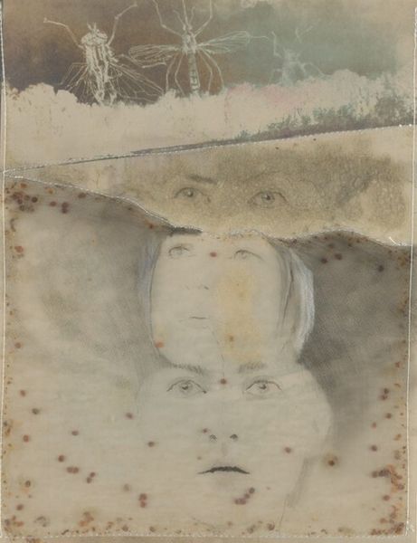 Editor: This mixed media print, including etching, is Rand Robbin's "Death Watch from Duke's Hill" created in 1969. It's…well, a little unsettling. The large skull dominates, but then you notice the figures scattered around. What stands out to you when you look at it? Curator: The spatial relationships are indeed unsettling. Notice how Robbin juxtaposes textures. The smooth faces of the superimposed figures contrast starkly with the grainy, etched landscape and the skull itself. It's a collage effect that destabilizes the picture plane. Editor: So it’s less about a literal landscape and more about…different visual ideas layered together? Curator: Precisely. Consider the semiotics of the skull. Its position, looming large and slightly out of focus, immediately introduces a meditation on mortality – a memento mori, if you will. But the scale is off, denying a straightforward reading. Do you see any connections in color choices? Editor: Now that you point it out, the faded brown-reddish figures blend in with the landscape but they pop a bit, like their separate. Whereas the skull and one ghostly figure feel cooler in colour tone and further apart. Curator: An astute observation. It contributes to the overall disharmony and disrupts our expectations of perspectival space. Robbin uses these formal devices – texture, color, scale, layering - to construct a fragmented narrative. It prompts the viewer to contemplate a certain psychological impact rather than providing answers. Editor: It’s like a puzzle with missing pieces. I see that formal elements are the key, as they show both a unified mood and jarring divisions. Thank you, that really clarified it for me. Curator: And for me, it shows the perpetual potential of new interpretations through close examination of composition and its subtle dynamics.