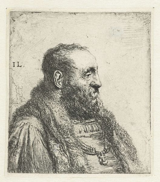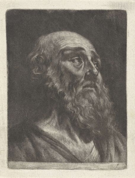 Curator: This etching, "Borstbeeld van een oude man," dating back to between 1625 and 1674 and attributed to Jan Lievens, presents a fascinating subject. The intricate linework captures an evocative image of aging, doesn't it? Editor: It really does! The figure looks world-weary, but also dignified. What I find striking is how the background of simple crossing lines really emphasizes the figure's intense stare. What do you see in this portrait? Curator: This face carries the weight of history. Every wrinkle, every line etched into his face, speaks of a life lived, lessons learned. Lievens offers us more than a likeness. Consider the beard – its texture, its fullness – isn't it suggestive of wisdom, experience accumulated over decades? The direction he is looking also invites the audience to look ahead to the future. Editor: That makes me think about how, even though this is one man, he could be seen to represent all older men, a stand-in for their collected wisdom? The everyman, perhaps? Curator: Precisely. His anonymity becomes his strength. But observe how Lievens uses light and shadow. Where does your eye fall first? Editor: Probably his eye or cheek… those are the darkest, most defined areas. Curator: Notice how those areas aren't simply dark, but convey character, insight. These details root him in a specific time and place, a Golden Age perhaps, but the archetypes still reverberate across the centuries. Editor: I hadn't thought of it that way, focusing less on the subject's immediate context. Thanks! Curator: Consider how these images act as mirrors reflecting back our own understandings and memories. Art helps us build those cultural continuities. Editor: Thank you for sharing that perspective!