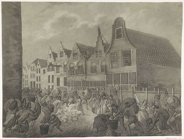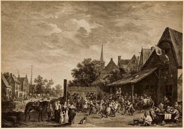 Curator: This engraving, entitled "Meeting of Men and Women in a Village," is attributed to Isaac Weissenbruch and dates between 1836 and 1912. It’s currently held at the Rijksmuseum. What jumps out at you? Editor: The immediate impression is bustle. There’s so much going on, but rendered in a very linear, almost reportage style. It feels like a candid snapshot, though I imagine carefully composed. Curator: Exactly. It feels incredibly authentic, capturing a slice of life in a rural setting. The way he’s used shadow creates this fantastic atmosphere of both excitement and, dare I say, underlying tension. The faces aren't particularly idealized, which I find quite refreshing. Editor: That tension feels tied to the gender dynamics present, perhaps even a subtle critique. We see clusters of men engaged in what appears to be a transaction of sorts around the table on the left. The women seem more peripheral, almost spectators to whatever's unfolding in the village square. Are they bartering? Gambling? The scene is active. Curator: It’s difficult to tell exactly, isn't it? It reminds me of old market days where trade was about so much more than just exchanging goods; it was a key social ritual. And let’s not forget, women’s roles at the time, especially in rural communities, were so tightly bound. Editor: Indeed, and note the horse being presented in the center. Land and livestock are often a backdrop, maybe even an emblem, to discussions of wealth and power. It could be symbolic of economic transactions occurring within a patriarchal structure, hinting at larger power imbalances. I appreciate how this deceptively simple scene has a narrative with multi-layered complexity. Curator: Me too! The artist cleverly uses the setting to highlight those subtleties. The detail, the very human qualities of the characters… I can almost hear the sounds of the village. It really speaks to me. Editor: Absolutely. This image allows us to consider what village life in that period signified for different genders and social strata. Thanks for bringing it to our attention!