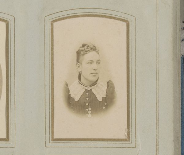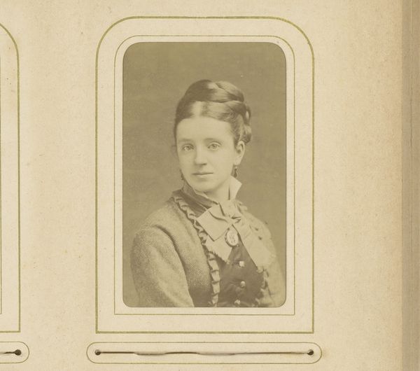 Editor: We're looking at "Portret van een vrouw," a gelatin silver print likely created between 1860 and 1900 by Langer & Pommerrenig. There's something incredibly direct about her gaze; almost confrontational. What can you tell me about the context of portrait photography at this time? Curator: The advent of photography dramatically democratized portraiture. Before, painted portraits were largely the domain of the wealthy. What we see here is the rise of a burgeoning middle class seeking ways to represent themselves, participating in visual culture in ways they couldn’t previously. Have you noticed the frame, the way the photo itself is presented? Editor: Yes, it has that ornamental border typical of the time. Is that significant? Curator: Absolutely. Consider the socio-political context: burgeoning industrialization, shifting class structures. This photograph, presented almost like a miniature painting, becomes a tangible marker of social standing. It’s an object meant to be displayed, shown to visitors, potentially circulated amongst family members. It speaks to ideas of self-presentation, aspiration, and permanence in a rapidly changing world. How do you think that impacts how we view the subject's expression? Editor: So, the subject's serious demeanor, far from just being about the style of the time, could also reflect the gravity of participating in this new form of representation. It makes me wonder about her story, her life. Curator: Precisely. And it highlights how the simple act of taking a photograph isn't simple at all; it's embedded within layers of social, economic, and technological shifts. Editor: I hadn’t thought of it that way. I was focused on the individual, but you’ve really highlighted the broader historical forces at play. Thanks for sharing that insight.