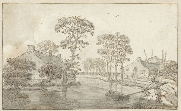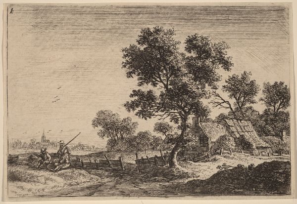 Curator: Anthonie Waterloo's etching, titled "Churchyard at the Waterside," presents a serene landscape typical of the Dutch Golden Age. The date is unknown but we can see the classic components of its time. Editor: Yes, that initial impression is of calm, almost meditative stillness. The composition directs your eye gently from the detailed churchyard on the left to the expansive, airy sky on the right, balancing the earthly and ethereal elements. Curator: Precisely. Waterloo was exceptionally skilled at capturing the essence of the Dutch landscape. This particular piece offers insights into the role of the church within Dutch society at the time— a quiet presence integrated with nature and the waterways. It is a world opening up with new ideas following years of war. Editor: It’s amazing what he accomplishes with line work alone. Look how he differentiates the textures—the dense foliage, the solid stonework of the church, the almost palpable stillness of the water. He truly understands how light shapes form. I find how Waterloo uses the verticality of trees in combination with architectural structures on the horizon striking. Curator: Consider too the burgeoning print market, which afforded artists like Waterloo opportunities for wider dissemination of their work. Prints like these democratized art consumption in ways previously unseen. These landscapes were no longer just for the wealthy elite. They offered ordinary citizens some semblance of connection with places both near and far. Editor: True, and his choice to feature ordinary figures in the foreground invites a broad audience to place themselves within the scene. The very minute variations in depth through controlled biting and layering create the optical illusion of reality in an otherwise static medium. The scale between the human and nature, like the size of boats versus open waters, creates an impression. Curator: Ultimately, Waterloo's landscape encapsulates the core values of the Dutch Golden Age: trade, exploration, community and an appreciation for the beauty of the local land. It's accessible and representative of an era's values. Editor: And viewed formalistically, the success here lies in his command of form. His etching provides depth that is both sophisticated and, because of its seeming naturalism, incredibly appealing.