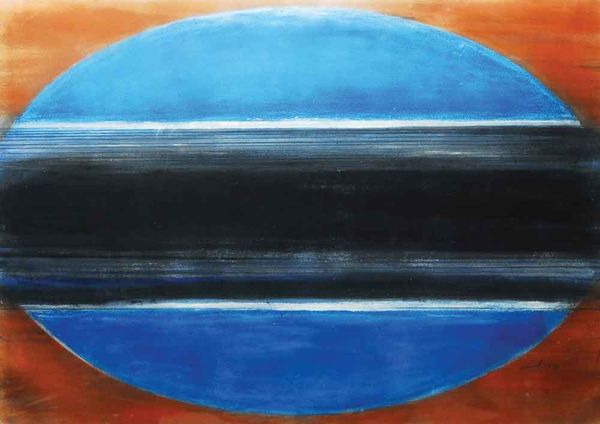 Curator: Here we have Arthur Dove’s “Red Sun,” an oil painting rendered in 1935. I’m struck immediately by how elemental it feels. Editor: It has an unsettling energy to me. That spiraling sun… is it rising or falling? There’s an ominous quality to its intensity against the muted blues and greys. It certainly challenges any idyllic vision of the American landscape. Curator: Absolutely. The spiral motif Dove employs throughout the sun echoes symbols present in indigenous cultures – specifically relating to cyclical time, growth, and energy. Its placement suggests a connection between natural forces and human existence. Dove, remember, was deeply immersed in questioning the status quo through explorations of alternate spiritual beliefs and rejecting industrialisation during this era. Editor: I'm also drawn to those striations in the foreground – the layers of the land itself. They remind me of ancient markings on the earth, holding both historical weight and a contemporary perspective as agricultural patterning of crops. The abstracted landscape challenges a sense of American idealism after the Depression Era. It acts as a marker, a palimpsest if you will. Curator: A potent observation. Looking at it through a modern lens, those ground patterns take on new meanings when considering agricultural policies that often benefit only a segment of the population, while pushing small farmers and laborers into unsustainable conditions. Editor: And those muted tones – they speak to resilience in the face of ecological destruction. It asks questions: How far can we push the earth before that fiery red sun turns apocalyptic? What stories will these layered markings on the Earth tell future generations? Curator: That balance between destruction and promise – it’s right there in Dove’s abstraction, refusing to let the viewer settle into a complacent viewing experience. It allows it to be reread throughout different cultural shifts. Editor: Yes, indeed. The painting invites a profound conversation about humanity’s ongoing negotiation with nature and societal power structures, made ever more pressing by today’s climate emergencies. Curator: A stark reminder of how artwork from the past continues to question our present and illuminate pathways for our collective future. Editor: Exactly. A deceptively simple visual statement that reverberates with complex meanings about sustainability and hope.