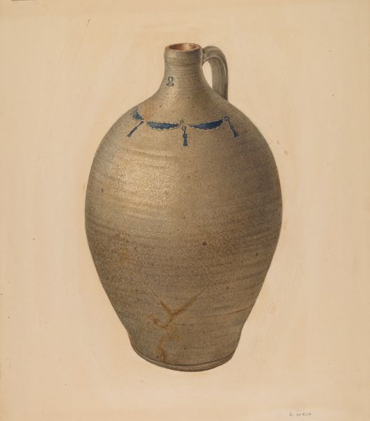 Charles Caseau made this drawing of a jar using, what looks like, watercolor. I love the way the colors bleed into each other, it's like watching clouds mix in the sky. You can see the artist exploring the form, letting the paint flow and settle, embracing the accidents. The texture he achieves is remarkable—that mottled surface of the jar, it’s almost like you can feel the grit and imperfections of the clay. Look at how the blue seeps into the beige, creating these unpredictable patterns. There's a real sensitivity to the medium here. It’s not about perfection; it’s about capturing the essence of the jar, its weight and volume. Notice the blue drips and splatters, especially towards the base – these aren't mistakes but moments where the artist allows the material to speak. Caseau reminds me of Giorgio Morandi, with their shared love for humble, everyday objects. Both artists invite us to slow down and appreciate the subtle beauty in the mundane.