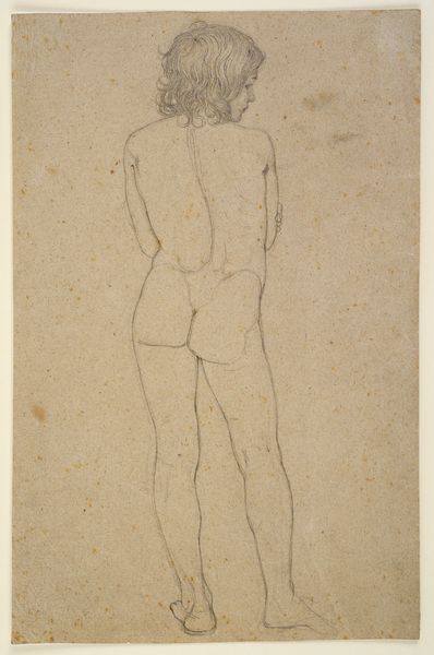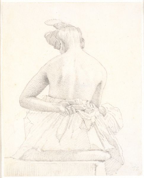 Editor: Here we have "A Nude Woman Seated, Facing Left, with Right Hand Raised" by Nicolai Abildgaard, made sometime between 1743 and 1809, a drawing rendered in ink on paper. It feels…classical, but the lines are so immediate, almost sketchy. What do you see in this figure's posture and gesture? Curator: The raised hand is key. It immediately activates associations, doesn’t it? Think of similar gestures across art history – supplication, invocation, even theatrical exclamation. Her slight contrapposto and coiled hair bring to mind ancient sculptures, fragments recovered from classical antiquity. But consider: why would Abildgaard choose this particular set of visual references? What feeling might this image evoke for his contemporary audience? Editor: Maybe it’s about idealized beauty, but with a rougher edge, less polished than a marble statue. Was he commenting on or updating those earlier images? Curator: Precisely! Look at how he uses shadow to model her form. Where does the light seem to originate? It almost feels internal, like knowledge illuminating her from within. Also note the position of her left hand; does she look vulnerable, maybe a little afraid? It makes us wonder about her state of mind and inner feelings. This artist is trying to give insight into an emotional experience. The woman becomes more human. Editor: So, this is more than just a study of form; it is using classical imagery to convey real human emotion? Curator: Absolutely. It’s about layering cultural memory with individual experience. Editor: I hadn't considered all the ways that posture and gesture, rooted in classical art, could add layers of emotional and cultural meaning here. Curator: Indeed. That is the power of an enduring image.