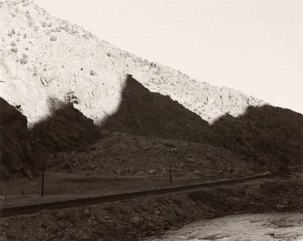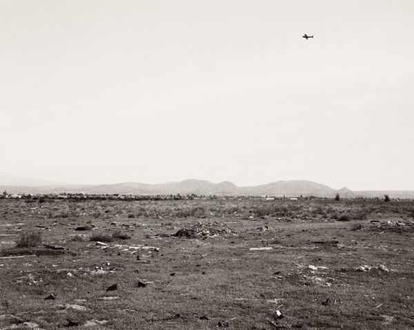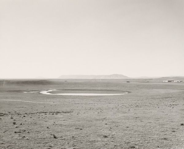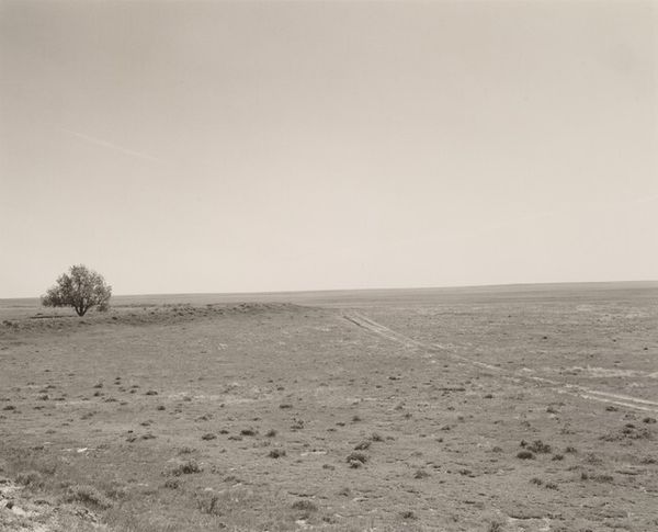 Editor: Here we have Lewis Baltz's "Looking Southwest from State Highway 248, 0.1 Mile East of Buffalo Bill Drive," a gelatin-silver print from 1979. I'm immediately struck by its starkness and the sense of almost desolate space. What readings does it suggest to you? Curator: Desolation is certainly a powerful initial reading. I see a landscape marked by intervention. Note how the tire tracks scar the foreground. The landscape is a repository of countless, often conflicting symbols. This piece invites us to consider how we assign meaning to the environment. Editor: So you’re saying the landscape isn’t just a neutral backdrop but is actively shaped by human activity? Curator: Precisely. Baltz directs our gaze to how roads and industry impact even seemingly untouched spaces, changing our memory of this landscape. Buffalo Bill, invoked in the title, once stood as a symbol of the romanticized West. By 1979, that symbol collides with stark industrial intervention. Do you feel a sense of loss here? Editor: Definitely. The monochrome palette amplifies that sense. It’s as if the image is drained of life. Curator: Yes, and in stark contrast to color landscape photography, that draining serves a specific purpose, turning the idealized symbol on its head, offering social critique. Editor: It’s fascinating how Baltz layers these visual and cultural elements. I hadn't considered the "Buffalo Bill" reference within the photograph itself. I now appreciate it more than just an uninteresting capture of the landscape! Curator: I agree. The symbolism transforms a seemingly straightforward photograph into a meditation on memory, industry, and the evolving American landscape.