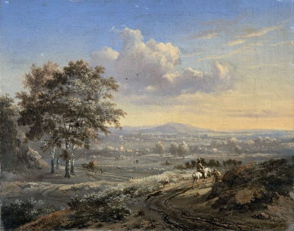 Curator: This watercolor, "Eu, looking towards Tréport," was created by Clarkson Stanfield, though the precise date remains unknown. What strikes you first? Editor: The subdued palette and almost idyllic setting. It feels like a staged pastoral scene. Curator: Stanfield's use of watercolor here is quite masterful. The layering of washes creates a sense of depth, drawing the eye from the foreground to the distant town and the sea beyond. Editor: It is interesting to consider that this scene depicts a place being shaped by urbanization and industrial activities, reflected by workers and livestock on the land. The cathedral looming may represent an eroding sense of order and the impact of labor. Curator: I do find myself drawn to the foreground elements. The composition and the way he uses the trees to frame the view. The cathedral in the distance could also be seen as a symbol of permanence against temporal life. Editor: The artwork provides a rich context for considering the social transformation impacting this landscape and community. Curator: Indeed, and Stanfield's technical skill captures a fleeting moment with enduring beauty.