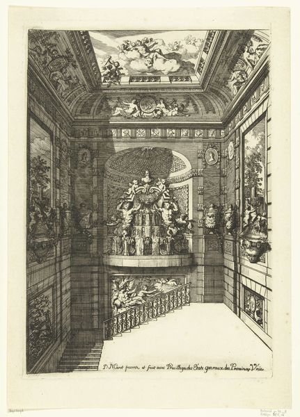 Daniël Marot created this print, "Nouveaux Liure de Pintures de Salles et d'Escalliers," using etching, a printmaking technique that democratized images in its day. The image shows us an idealized palace interior with a long hallway flanked by classical statues. Consider how the linear quality of the etched lines creates not just the scene but also a sense of depth and perspective. The act of etching itself involved a division of labor, with skilled artisans translating designs onto copper plates. This commercial print then allowed for mass production and distribution of Marot’s architectural visions. This print reflects the social context of its time, offering a glimpse into the opulent lifestyles of the elite. It also prompts reflection on the labor and resources required to construct and maintain such spaces, aspects that would have been largely invisible within the aristocratic realm. Ultimately, this print underscores how materials and making processes are embedded with cultural significance, challenging traditional distinctions between design, craft, and fine art.
