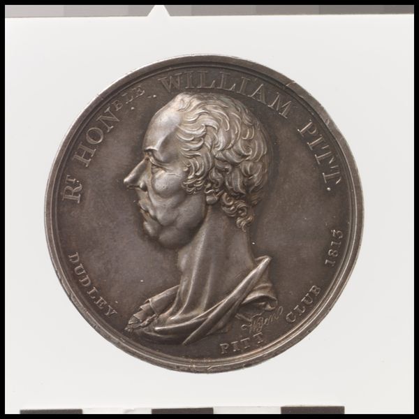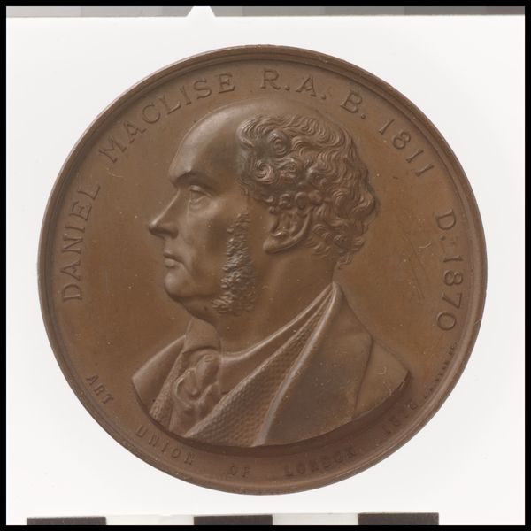 Curator: This metal relief sculpture, titled "Sir Francis Chantrey," was created in 1846 by William Wyon, and it now resides at the Metropolitan Museum of Art. It's a striking Neoclassical portrait medal. What's your first impression? Editor: Stark. Severe, even. The metallic sheen combined with the profile portrait gives it a sense of cold authority, almost Roman in its gravitas. Curator: That's a great observation. As a medal, this object would have served multiple purposes. Certainly commemorating Chantrey, who was himself a noted sculptor, but also participating in the broader culture of recognition within artistic and scientific circles. I’m curious about how its creation intersects with the labor of the mint and the economic systems supporting these artistic endeavors. Editor: And the choice of imagery is potent. The profile itself immediately invokes the classical world, echoing coins of emperors and philosophers. His balding head and severe expression suggests wisdom, discipline... perhaps a hint of the struggles inherent in the creative process. It's loaded with symbols of achievement. Curator: Interesting. I find the materiality just as compelling. The precision of the relief speaks to advanced techniques in metalworking and die-cutting. Consider the labour that went into creating the die! Moreover, such items often functioned within elaborate systems of patronage and exchange. The very material, the metal itself, carries an inherent value. Editor: True. And beyond the intrinsic value, there's the conferred status. A medal like this serves as a potent symbol of recognition. It carries cultural weight beyond the individual portrait. The act of awarding it elevates both giver and receiver. The visual language cements a certain cultural narrative of artistic excellence. Curator: Precisely. Reflecting on it, I'm drawn to how it encapsulates the relationship between the artist, the patron, and the wider social value placed on artistic skill within Victorian society. Editor: For me, the artwork’s evocative imagery creates an enduring monument to artistic legacy, sparking thoughts about the nature of fame and the cultural stories we choose to tell through symbols.