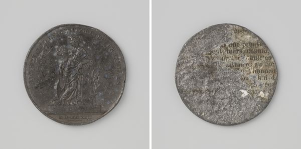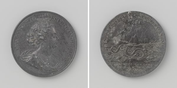 Curator: A first look at this, and the word that comes to mind is "restrained." Even the portrait, it's austere. Editor: I can see that. We are looking at a silver medal crafted by Monogrammist IB in 1766. It commemorates "The Inauguration of Willem V, Prince of Orange-Nassau, as Hereditary Stadtholder of the Netherlands." The iconography is palpable! Curator: Indeed! One side presents a portrait of Willem V himself. Circular text dominates—can you make that out? Editor: It looks like “GUILELMUS V D.G. PRINCEPS AUR. NASSAU H.” and “GUBERN. HÆRED. FOED. BELG.” Are those mottos traditional on commemorative medals? Curator: Certainly! Heraldic imagery on coins or medals carries tremendous symbolic weight, solidifying legitimacy and power across generations. Editor: The reverse side features an ornate heraldic crest beneath what appears to be a royal crown. Fascinating how a single emblem manages to synthesize dynastic lineage and geopolitical aspirations. The date appears at the base—MDCCLXVI, 1766. Curator: The very composition speaks volumes: The carefully arranged symbolic components seek to cement William’s authority within the collective consciousness of the Dutch Republic. Medals were important tools for image-making. Editor: In other words, not merely celebrating an event but actively constructing its meaning and memory through visual rhetoric. How interesting that they chose to employ an established visual language to subtly shape perceptions of hereditary power. It appears that the use of the Latinate text would enhance the impression of authority too? Curator: Exactly. By placing those recognizable visual codes, the image then echoes long-held associations of authority, grandeur, and historical destiny. The artist thus encodes specific values into the object. The use of a precious metal like silver would contribute, no doubt, to an impression of authority. Editor: Considering this as a physical object that one could hold—the coldness and density of silver combined with symbolic imagery—conveys a visceral sense of gravitas and enduring authority. That feeling in turn reinforces the cultural values invested within it. It really captures that Baroque impulse towards grandeur. Curator: Right—beyond simply presenting historical narrative, medals sought to instill certain social values within a community by manipulating familiar, emotive visual triggers. It prompts me to reconsider what stories we tell ourselves through symbols even today. Editor: This has really helped me consider the historical and emotional impacts beyond the immediate appearance. It has made me think a lot about modern coins.