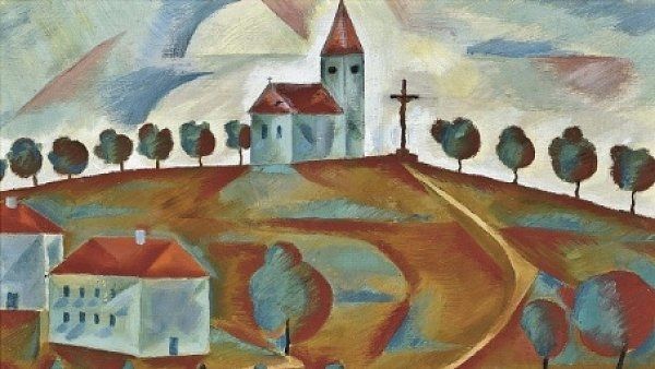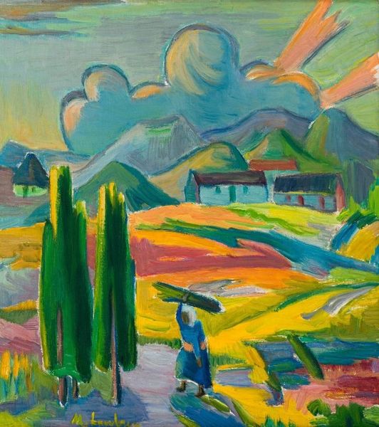 Curator: I find the swirling forms and slightly unnatural palette quite striking; there’s a tension between representation and stylized abstraction at play. Editor: Indeed. We’re looking at Thomas Hart Benton’s “Martha's Vineyard,” circa 1925, rendered in oil paint. For me, what jumps out is the evident physicality of the oil paint itself. You can practically feel the artist manipulating the material to sculpt the landscape. Curator: Precisely. The handling of the paint, particularly in the rolling hills and the swirling clouds, feels almost sculptural, underscoring the materiality of the landscape itself. One thinks of the artist as a laborer wrestling with earth. Editor: And that labor extends beyond the artist's studio, doesn't it? The subject matter—a somewhat domesticated landscape—hints at human interaction, the mark of inhabitants on the land. Even the telephone pole feels like a commentary on how industry shapes our engagement with nature. Curator: True, the telephone pole and structures denote the influence of infrastructure and the impact of development upon rural settings. But formally, consider the sinuous line that carries your eye up and over the hill – the curving path contrasting the angular house; it presents visual dynamism! Editor: Yes, it is dynamic. But consider who exactly gets to retreat to these settings! Regionalism in art, as often displayed by Benton and his peers, serves to reinforce myths of ideal American life in times of crisis, and also masks the realities of marginalized groups outside such places of economic privilege. Curator: That is important context. It’s easy to be seduced by the pastoral ideal that’s rendered on the canvas, however this idyllic visualization requires critical analysis beyond a solely visual reading. Editor: Agreed. Considering it through the lens of material production and social messaging unveils layers that pure aesthetics might obscure. Thanks, I see this oil painting more critically, as Benton surely aimed to be viewed himself. Curator: And for me, your material reading brings an important added understanding. Now that I've spent time considering these factors, I too notice much more detail to absorb!