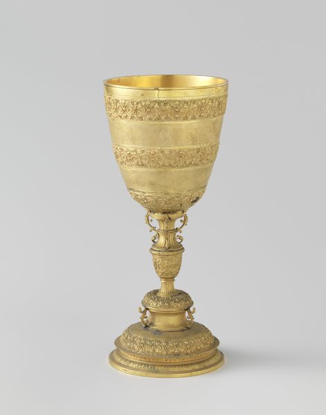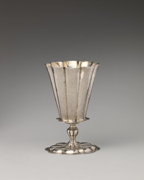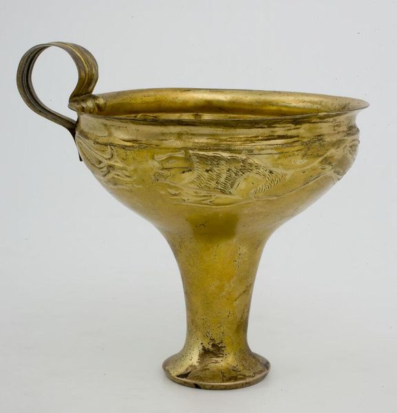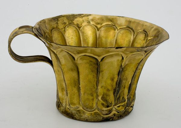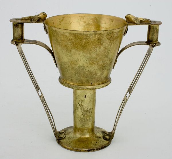 Editor: Here we have Josef Hoffmann's brass centerpiece bowl, created around 1924. The radiant gold color and stylized, almost celebratory form give it such an opulent, luxurious feel. What are your thoughts when you look at this piece? Curator: It's impossible to ignore the sense of celebration you mentioned, isn’t it? For me, Hoffmann's work here speaks to the post-World War I era, specifically for the wealthy. Although Hoffmann himself engaged with socialist politics, his work here caters to a wealthy class looking to move on with lavish displays, but the carefully chosen materials and refined style also give value to high craftsmanship and industrialisation in the 20's. How do you see the Art Nouveau influence playing out? Editor: The flowing lines of the handles, maybe? The whole design feels very organic, despite being crafted from brass. Does the bowl's functionality matter when considering it as an art object? Curator: Absolutely. We need to consider the inherent class politics embedded within design and craft, particularly with luxury items like this. Who had access to such beauty, and what does that say about the societal structures of the time? How does knowing the piece's purpose influence your reading of its aesthetic qualities? Editor: That makes me consider its presence as more than simply aesthetic. Its statement is really in the context of those who could afford it and place it centrally. Curator: Precisely! And considering Hoffmann's complex political leanings and his clients in this period adds layers of meaning. The act of displaying luxury itself becomes a statement, a testament to power and privilege. It gives new perspective, doesn’t it? Editor: It certainly does. I'll never look at a fancy bowl the same way again.